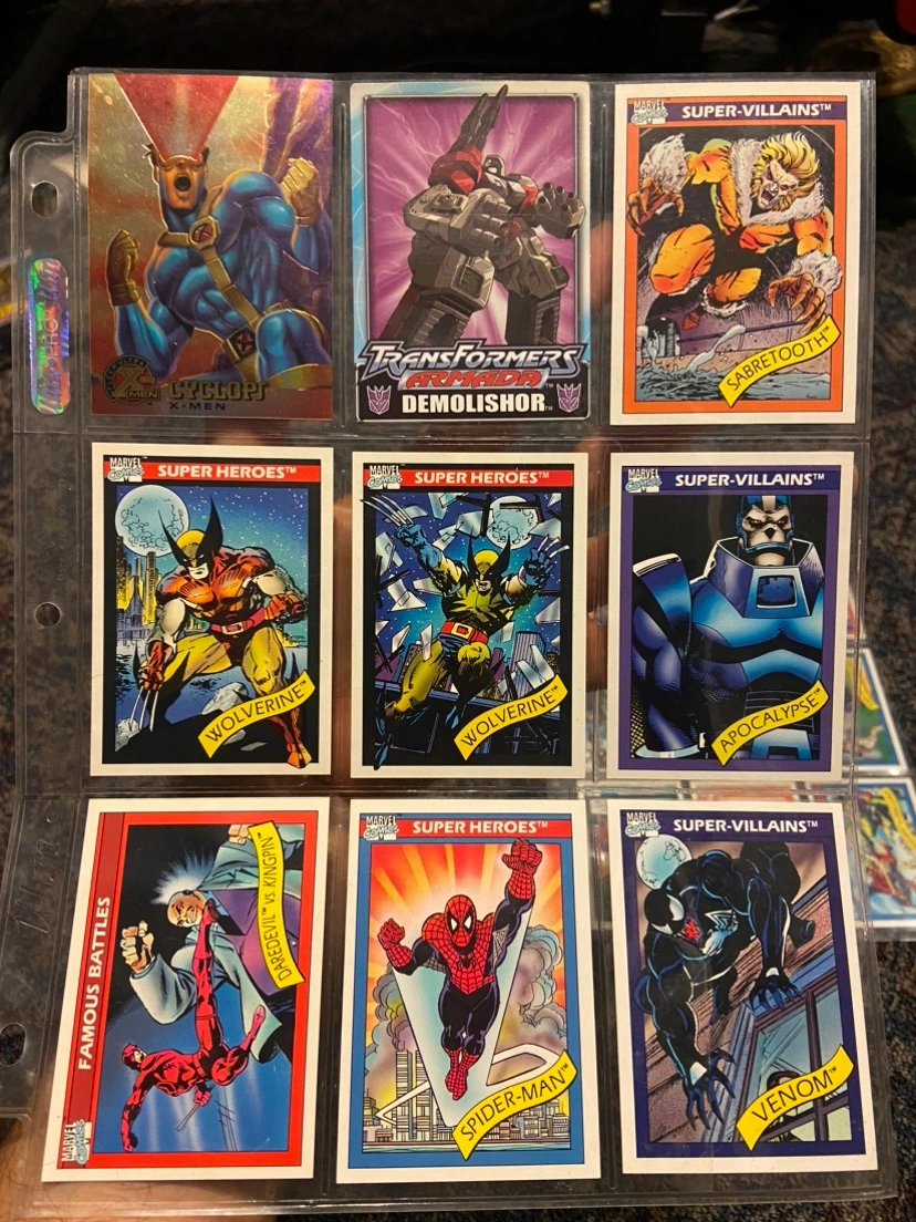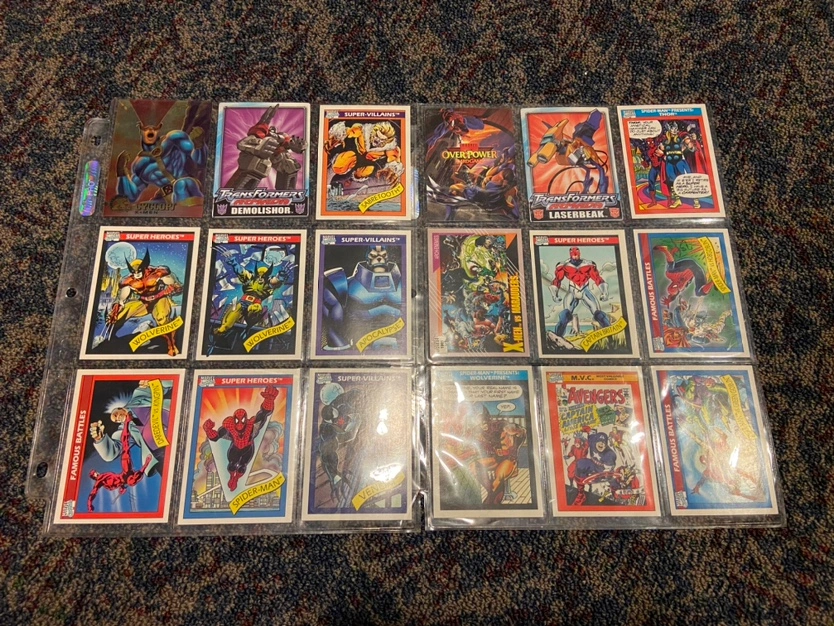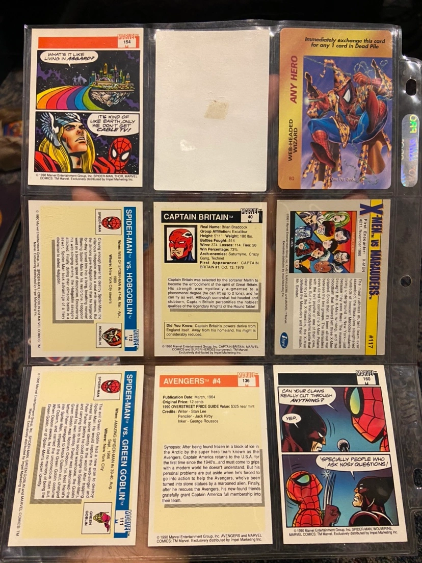 Set of Marvel Trading Cards, includes multiple characters and cards with different designs. Most cards have back information