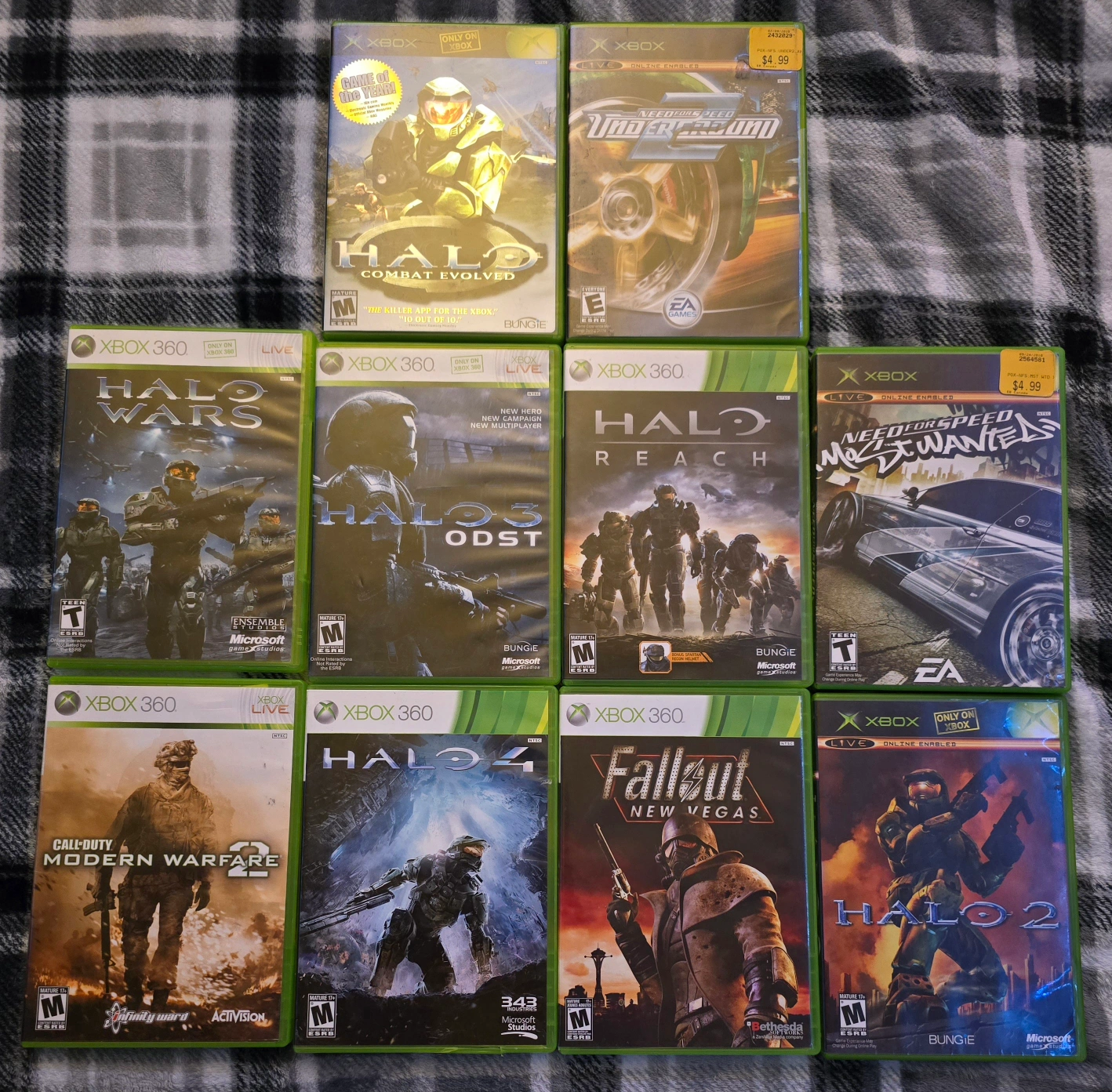 Bundle of Xbox 360 games. Includes: Halo: Combat Evolved, Need for Speed: Underground, Halo Wars, Halo 3: ODST, Call of Duty: Modern Warfare 2, Halo: Reach, Need for Speed: Most Wanted, Fallout: New Vegas, Halo 4, Halo 2.