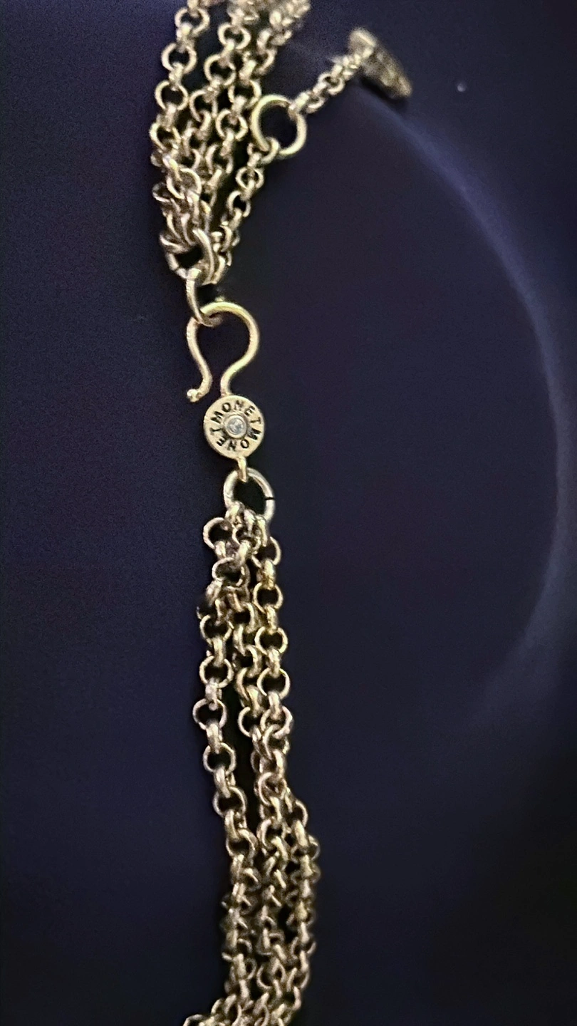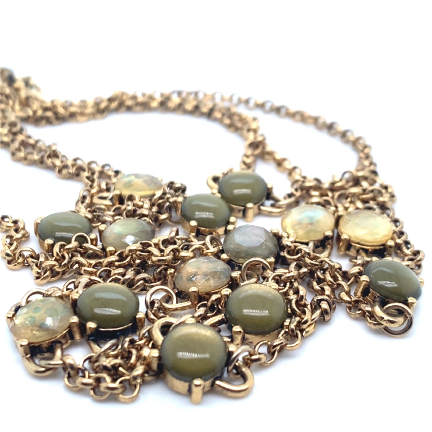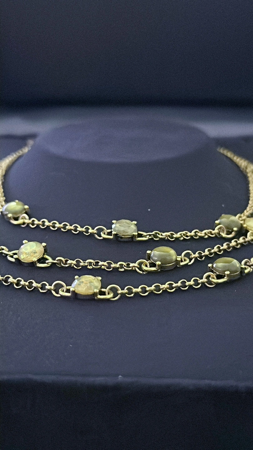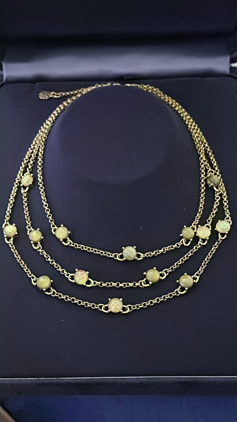 291Gold-tone multi-strand chain necklace with opal-like stones. Three strands of chain, each with five stones. This is one of my vintage necklace collection I’m trying to let go of.