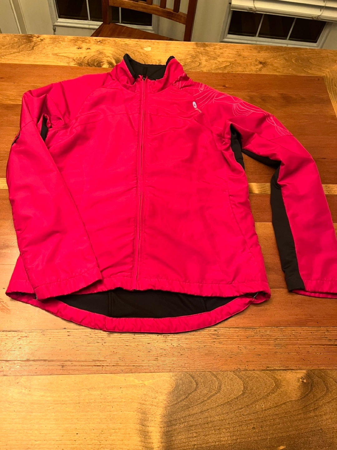 Pink and black cycling or running jacket with a full zip, pockets, and reflective details. Size medium. In great condition and all zippers in good working order!
