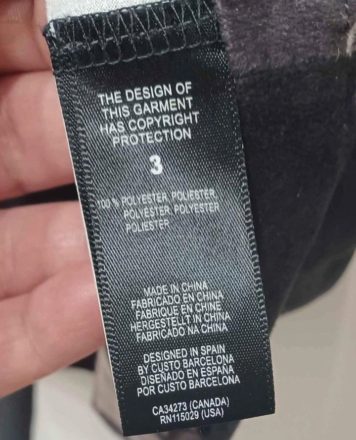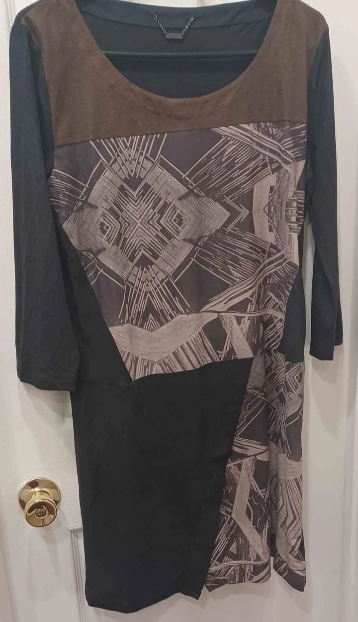 486Black and brown geometric print dress with 3/4 sleeves. Made in China, designed in Spain by Custo Barcelona. No issues and very soft