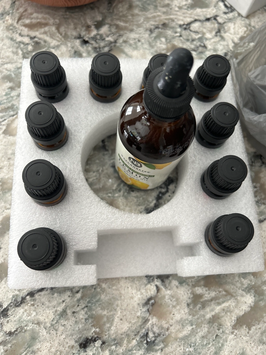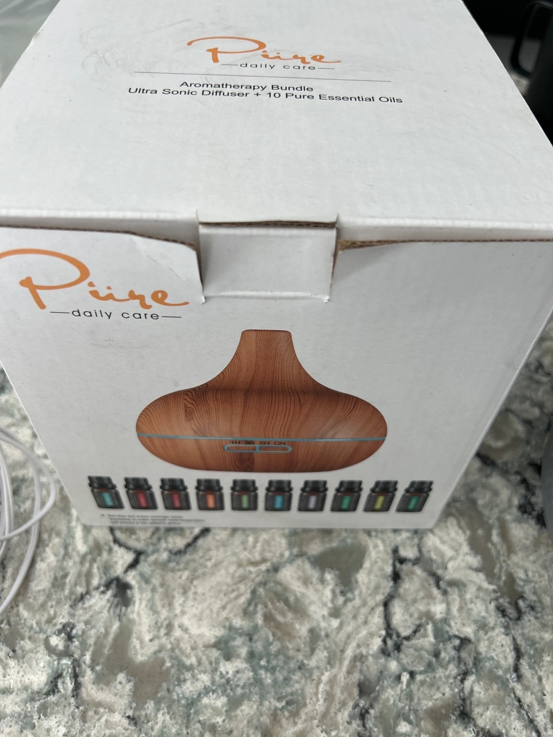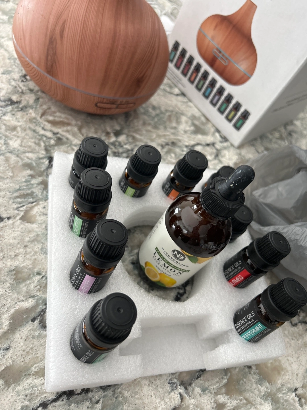 Ultrasonic diffuser with 10 essential oils. Wood grain finish. Includes power adapter.