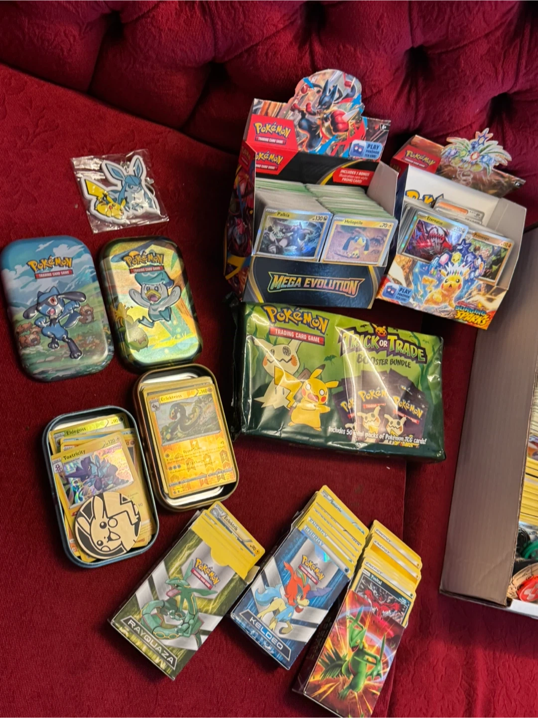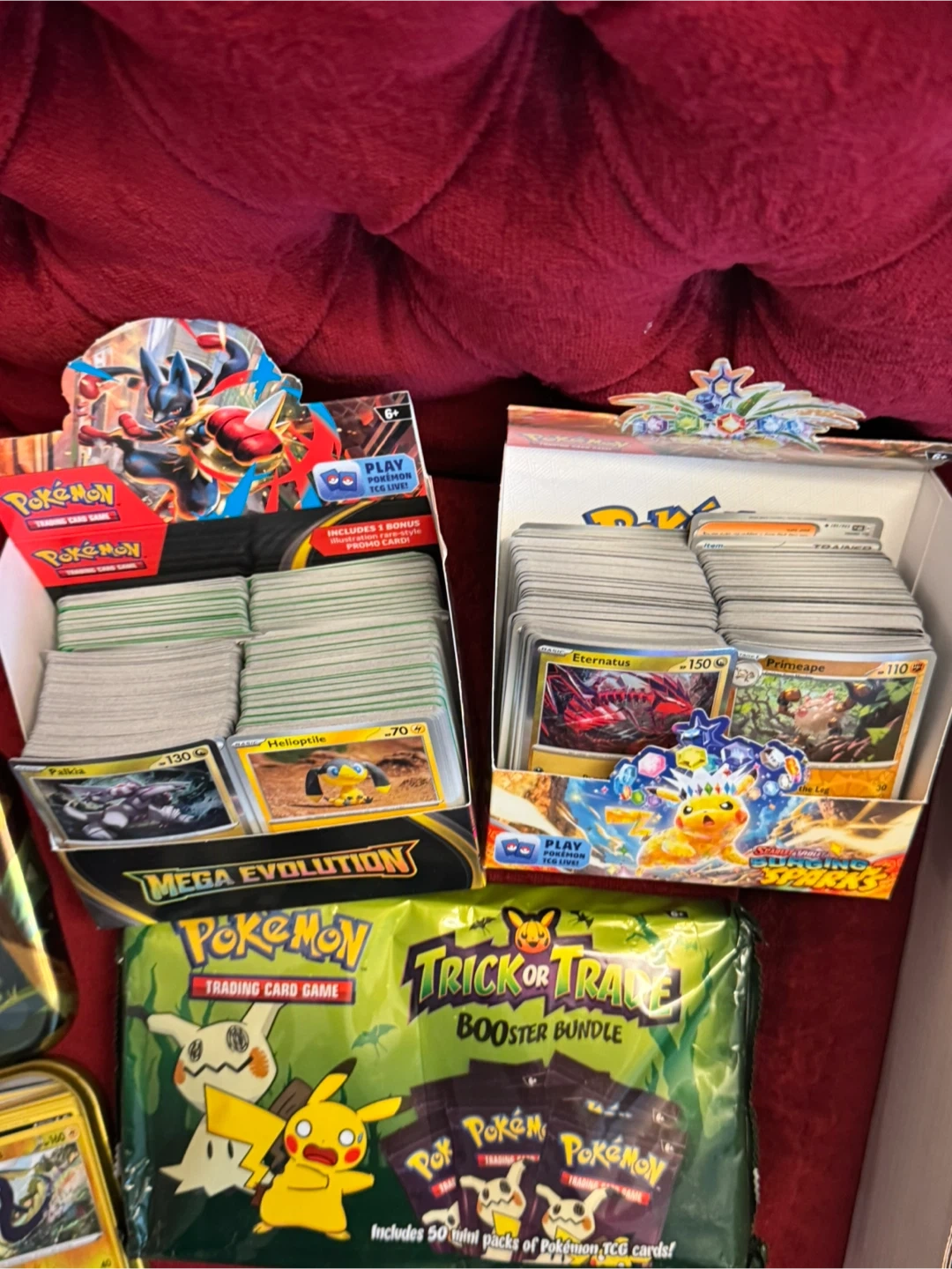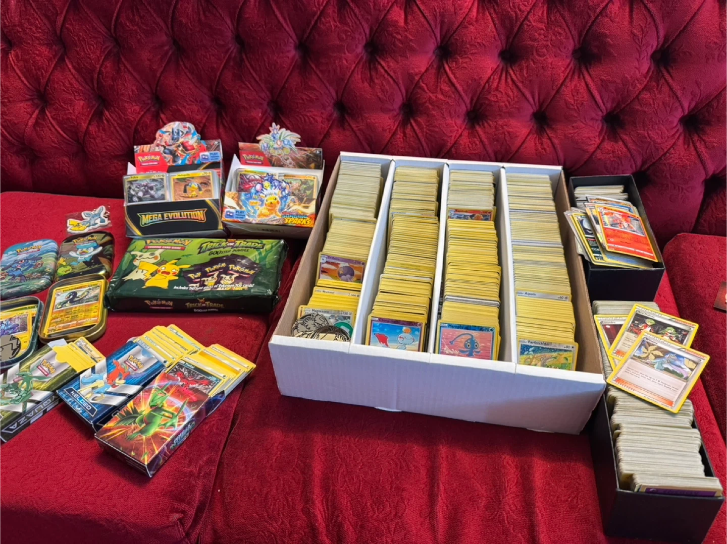 Massive collection of Pokémon trading cards, including booster bundles and display boxes. Features cards from various sets like Mega Evolution and Burning Shadows. This is a great starter collection for any Pokémon fan!