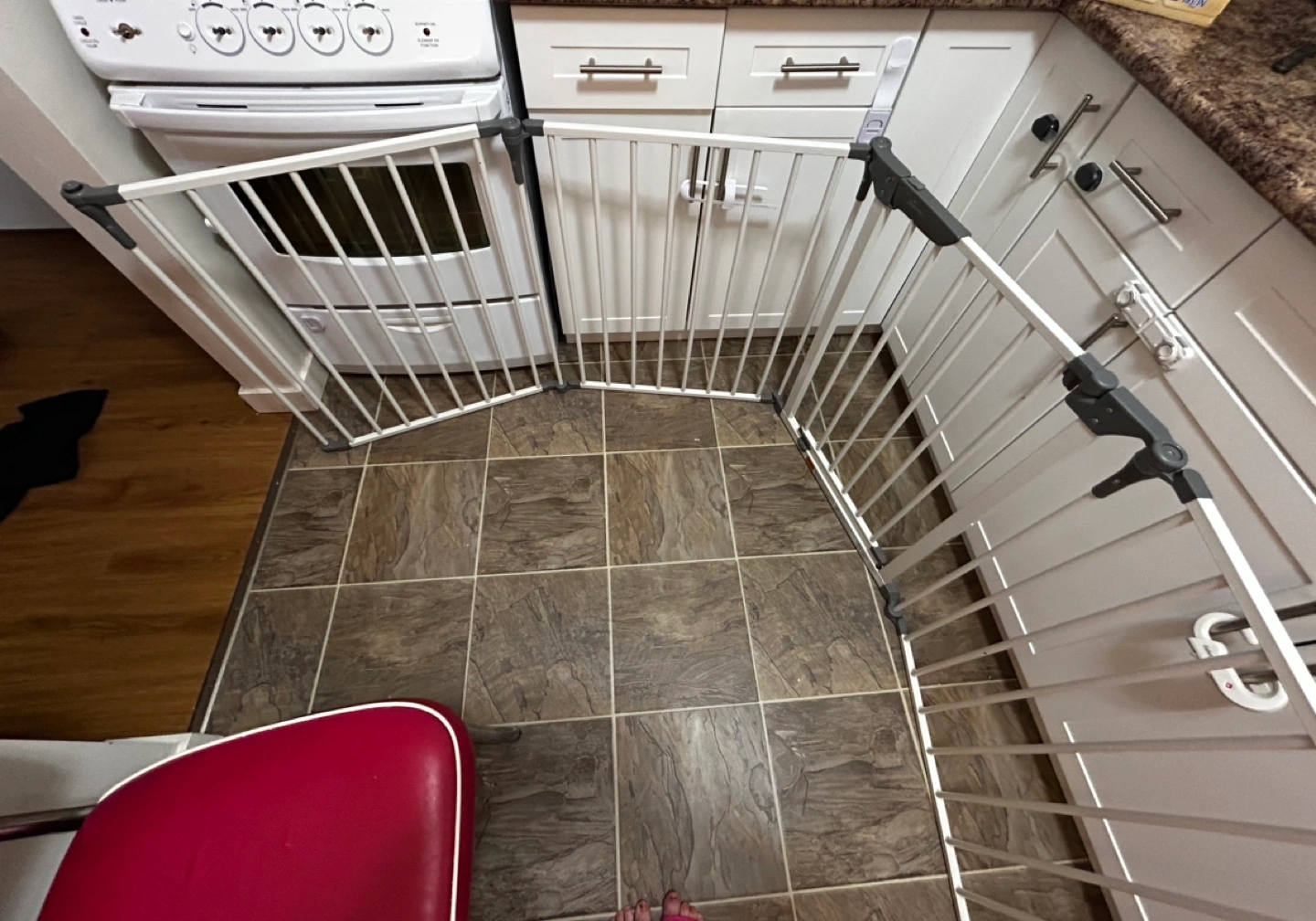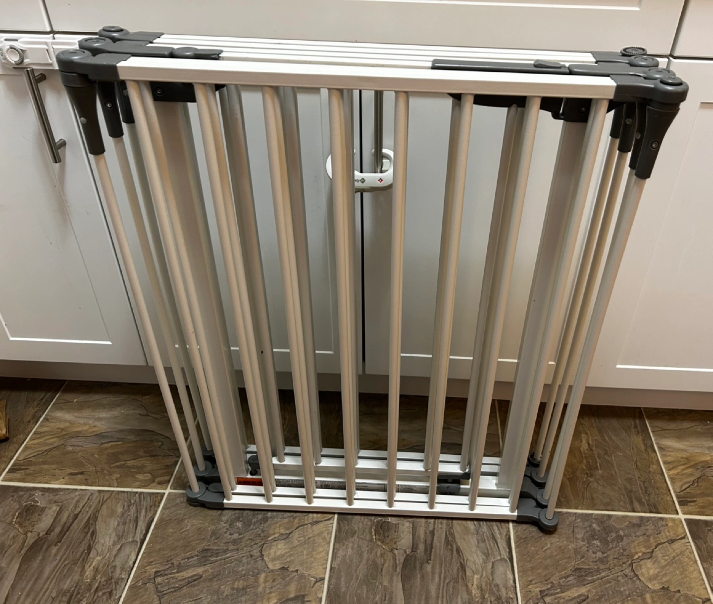 White baby gate that extends to fit a variety of openings. No installation required for usage. Height is in pictures of ad. And gate extends to about 12 feet.