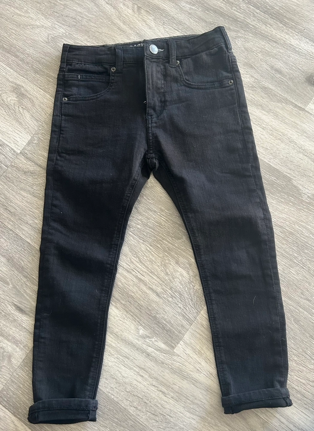 Black skinny jeans with elastic waistband and zipper fly. Size 4-5 years.