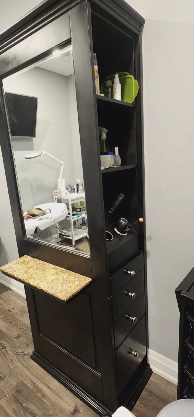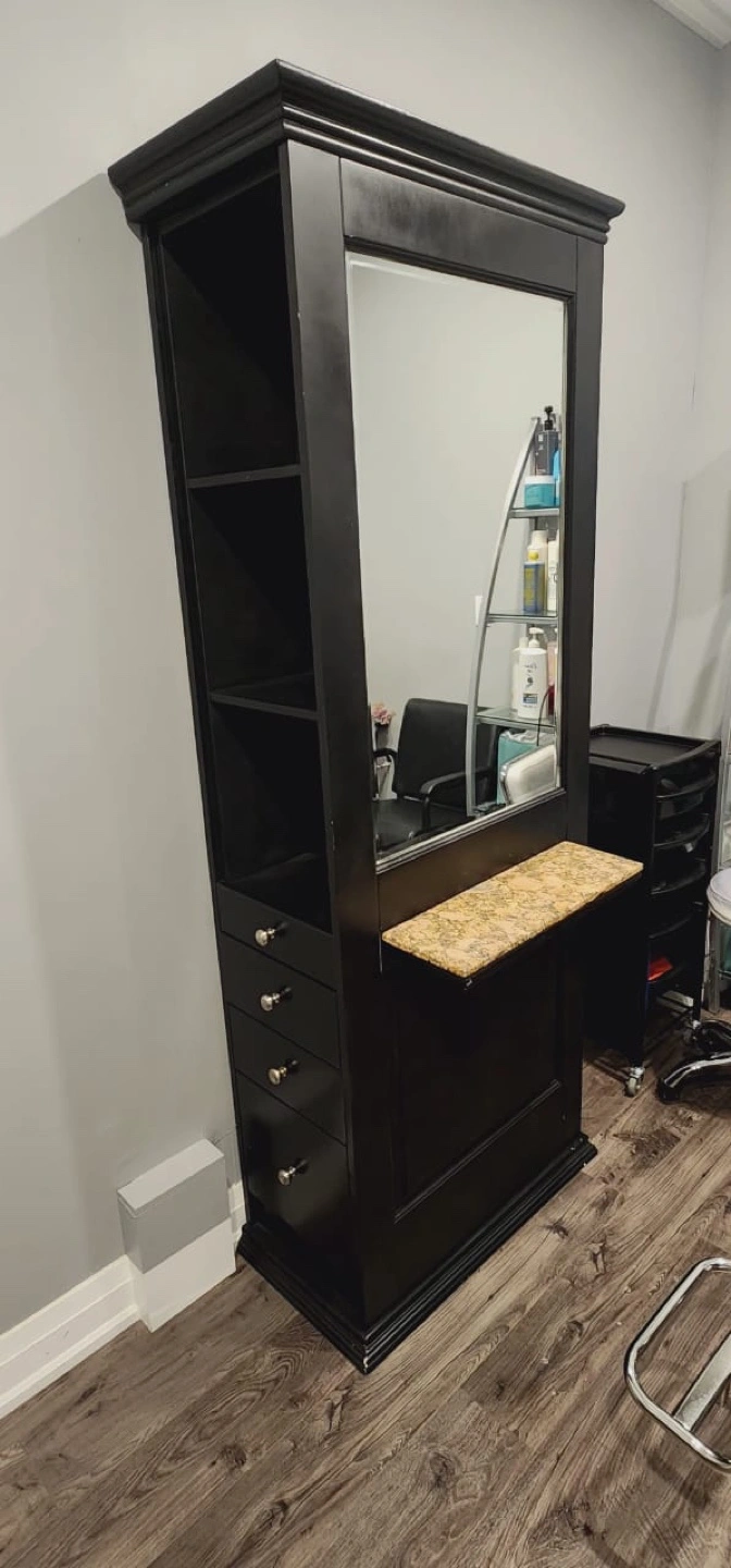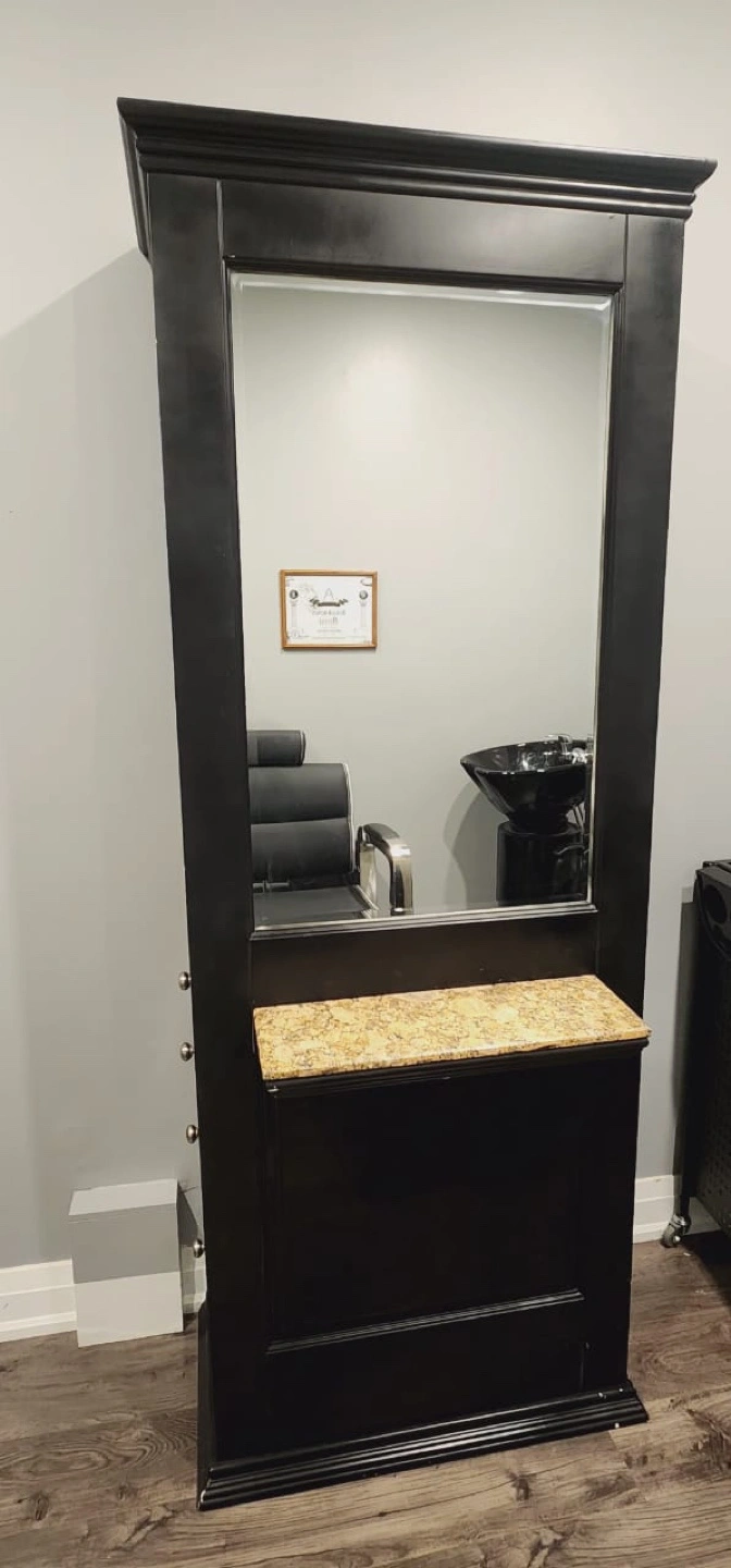 Black salon styling station with a mirror, four drawers, a granite countertop, and open shelves. 202 x 80 x 42 cm ๐บpick up location is New Market ๐บ