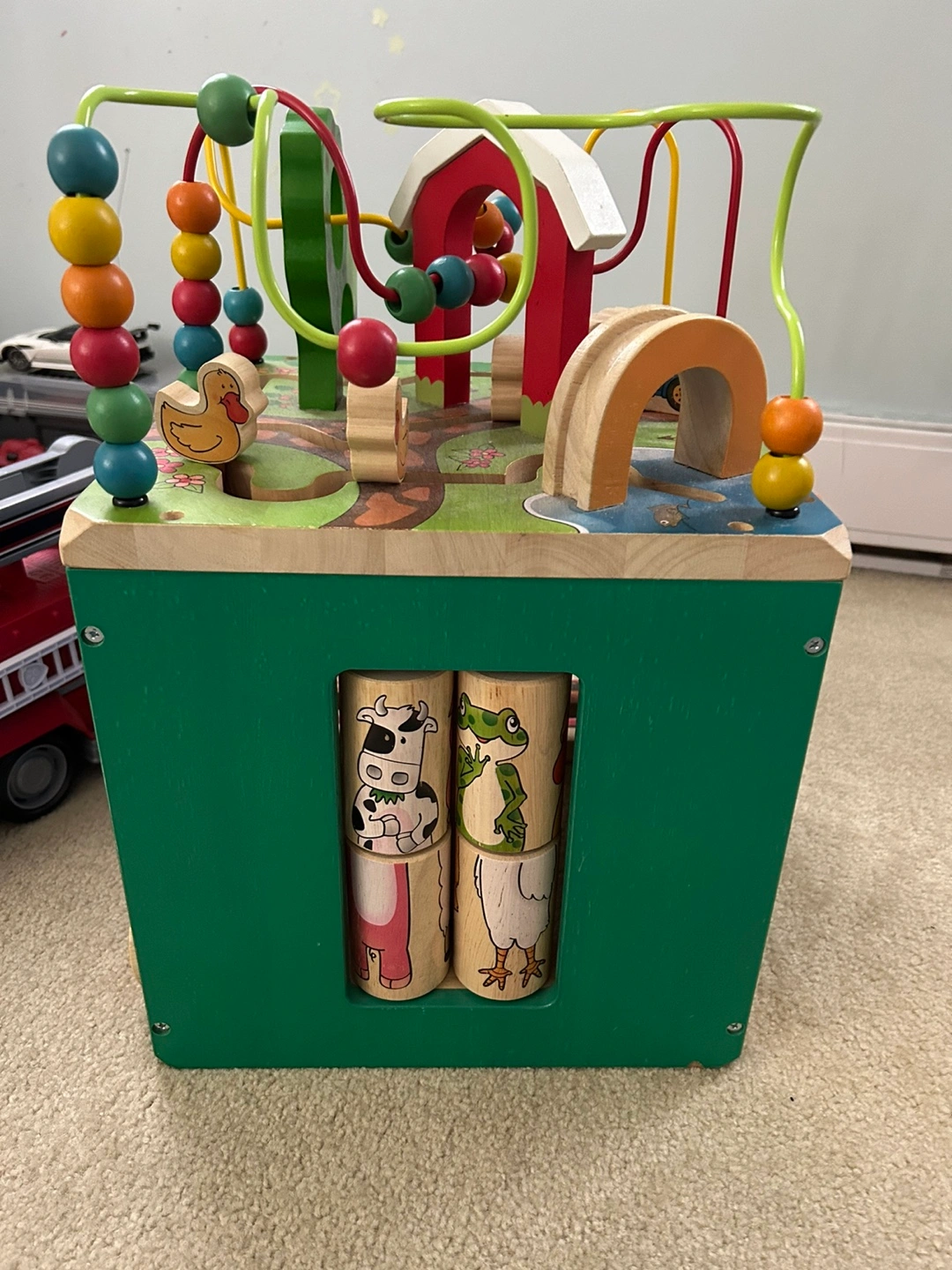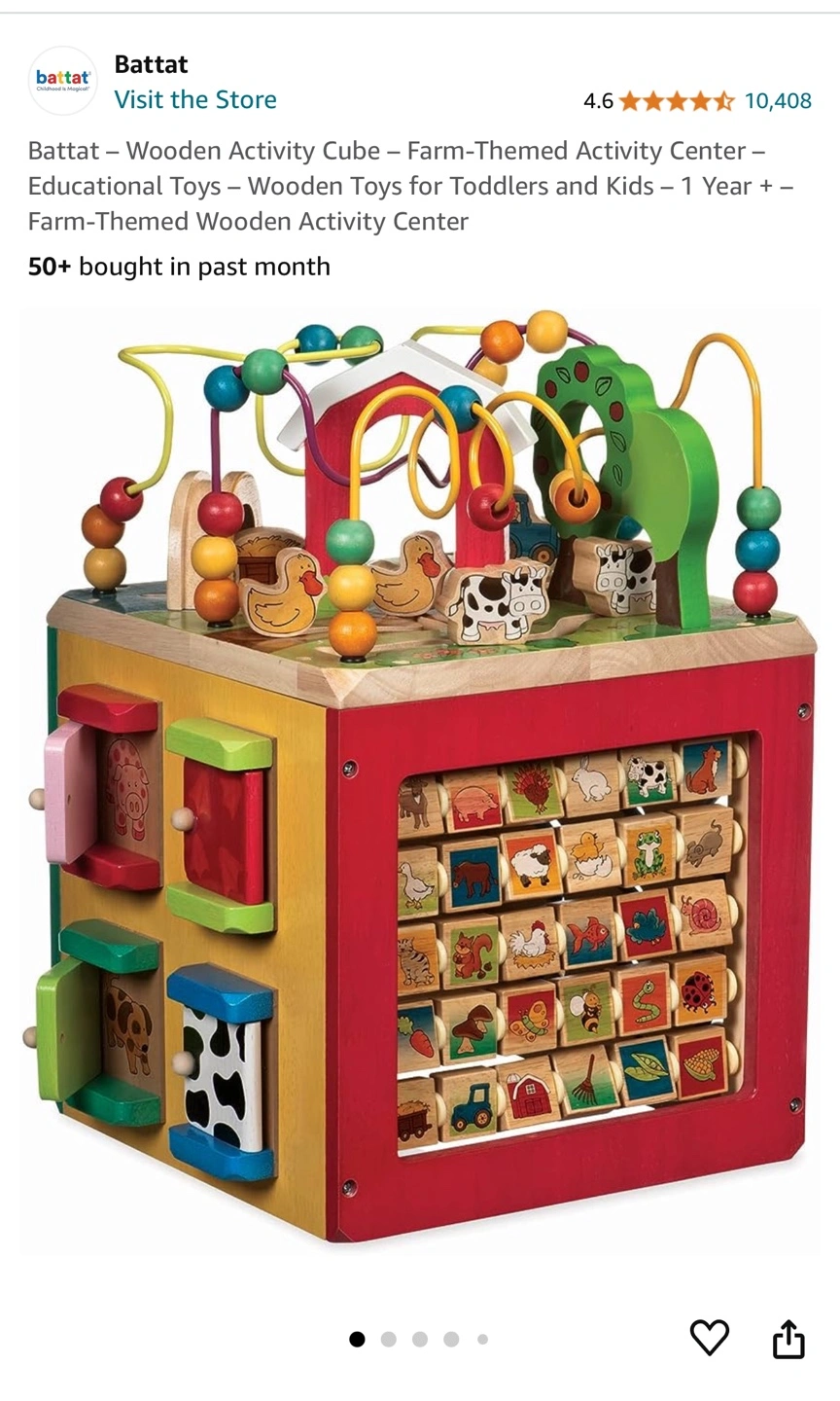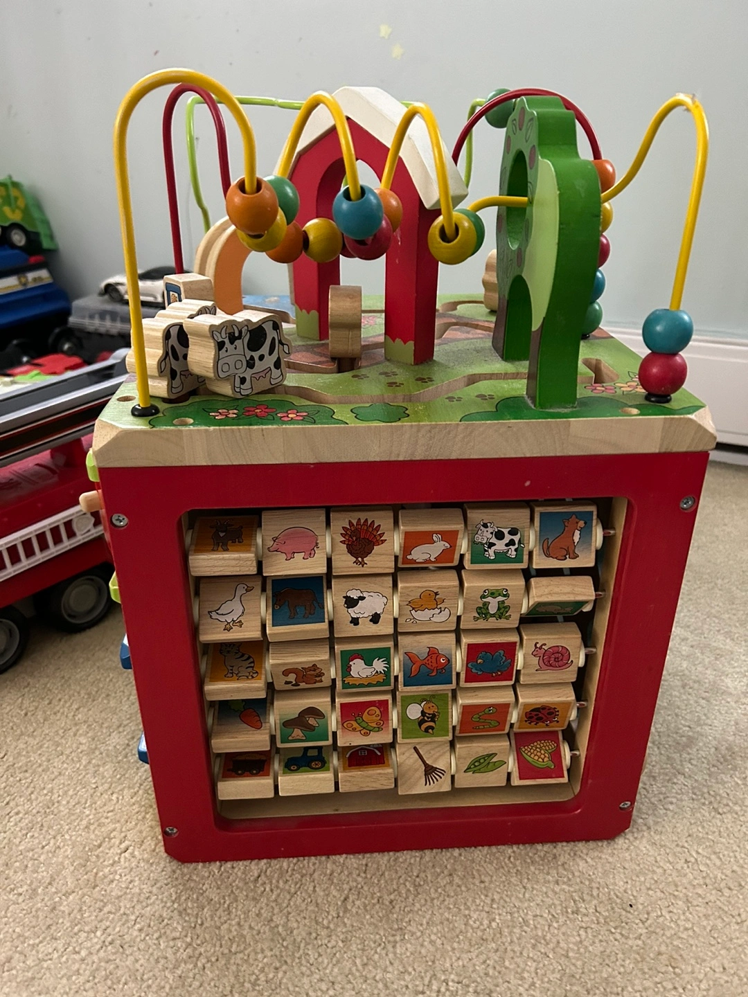 Wooden activity cube. Never really used as this was kept at parents. Solid and babies love them. Great for interacting and learning. Paid $120 5 months ago