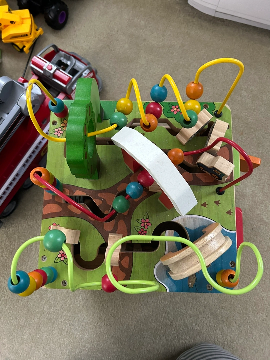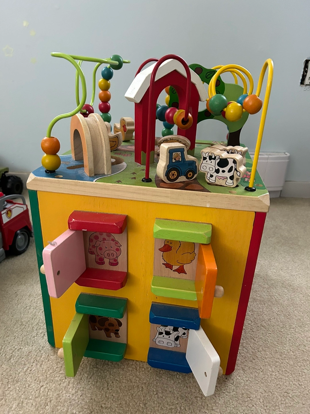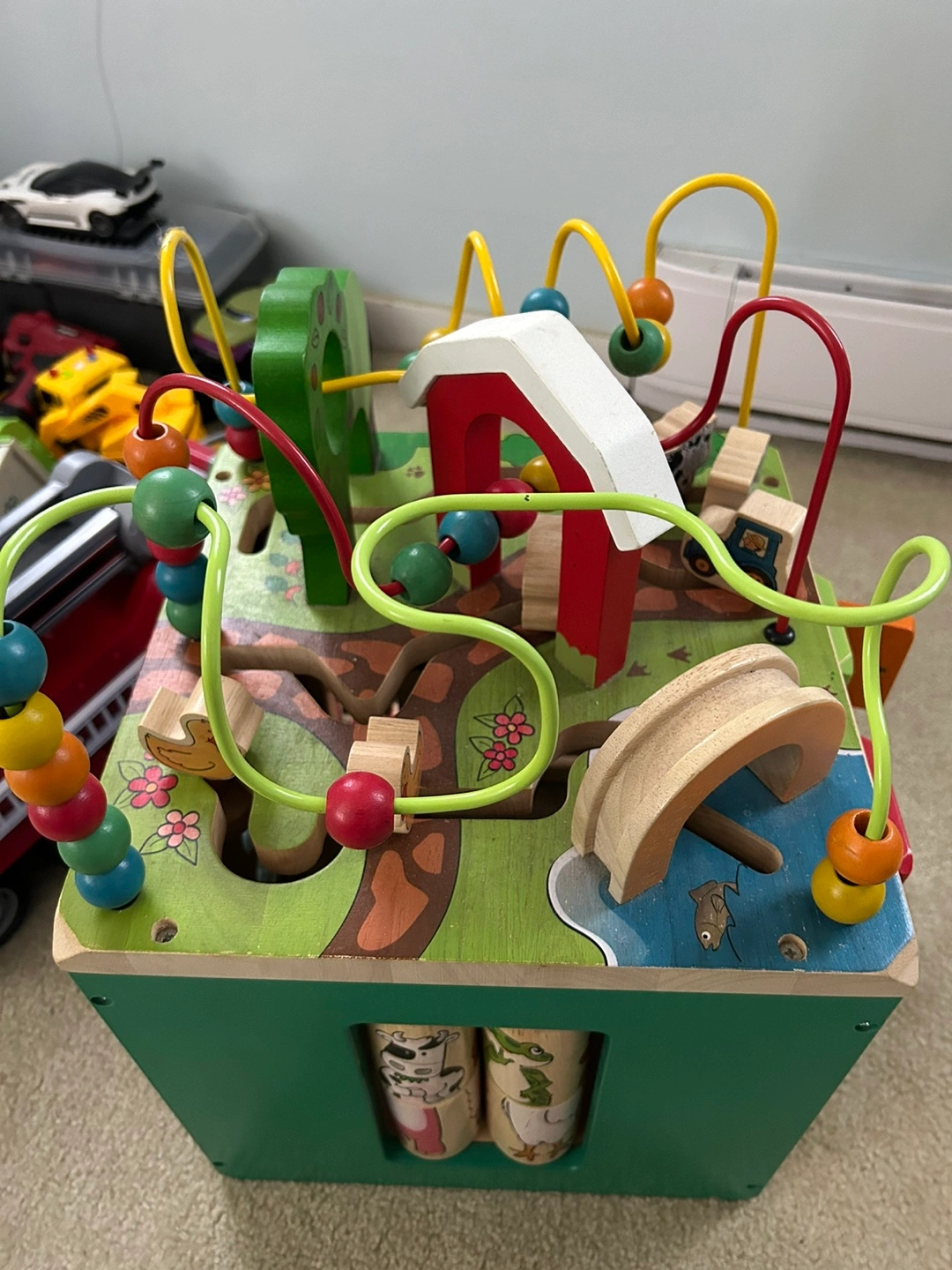Wooden activity cube. Never really used as this was kept at parents. Solid and babies love them. Great for interacting and learning. Paid $120 5 months ago