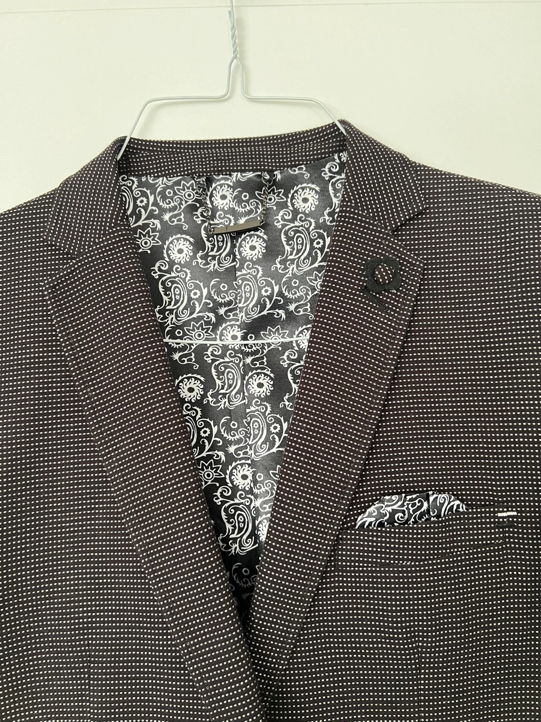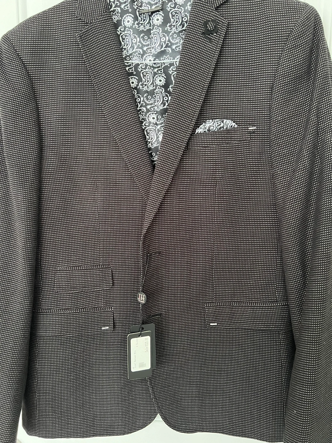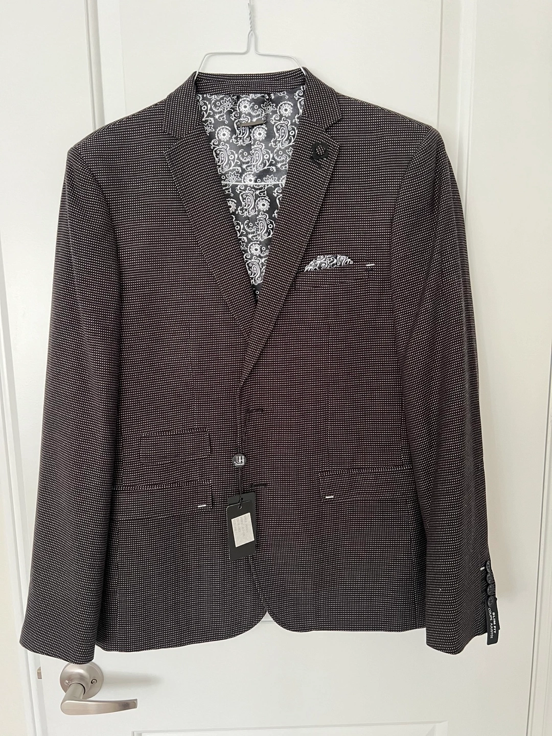 Black blazer with a paisley lining. Two button closure, two front pockets, and one breast pocket. Brand new ! Has never been worn , tags still on blazer