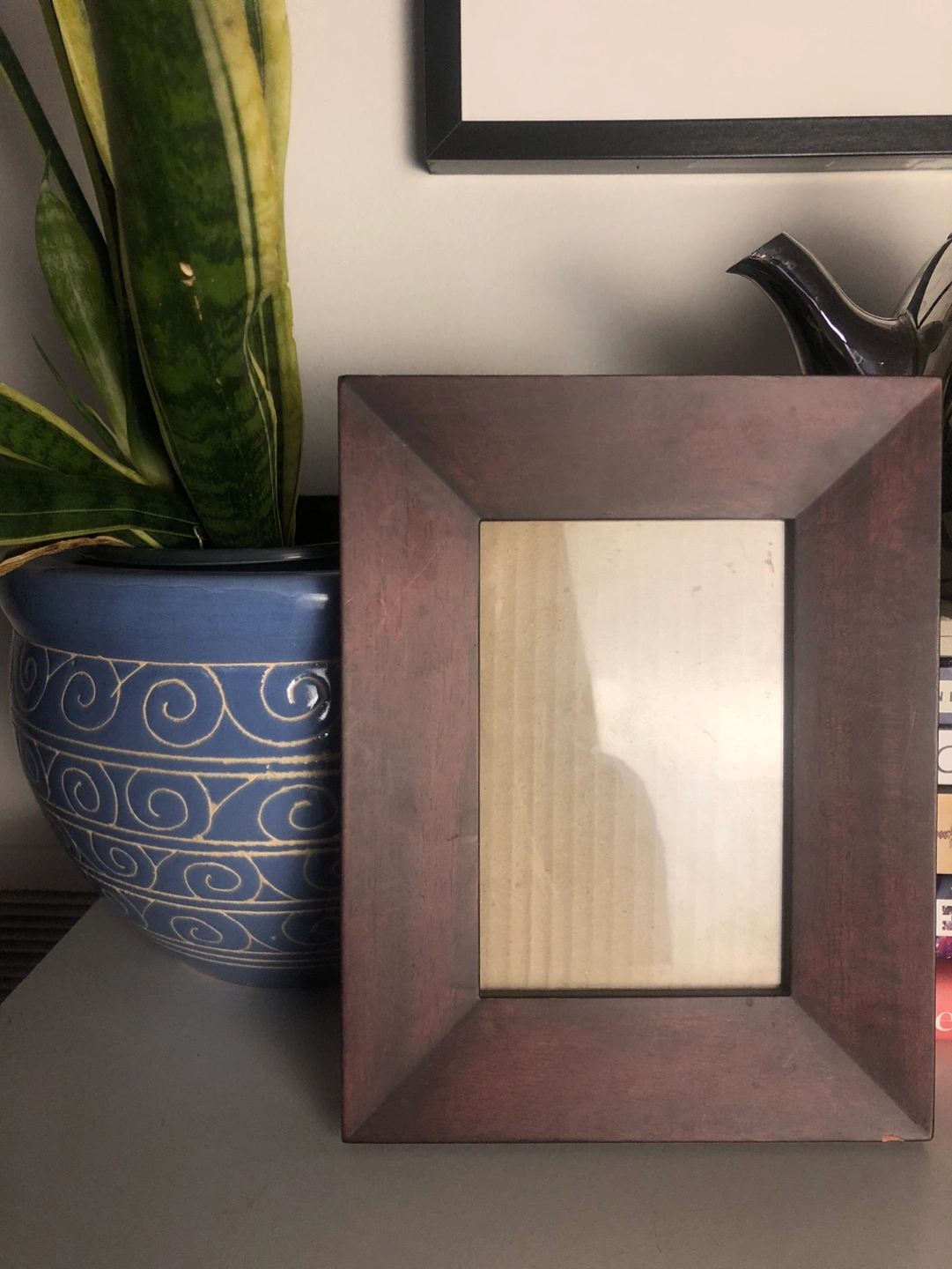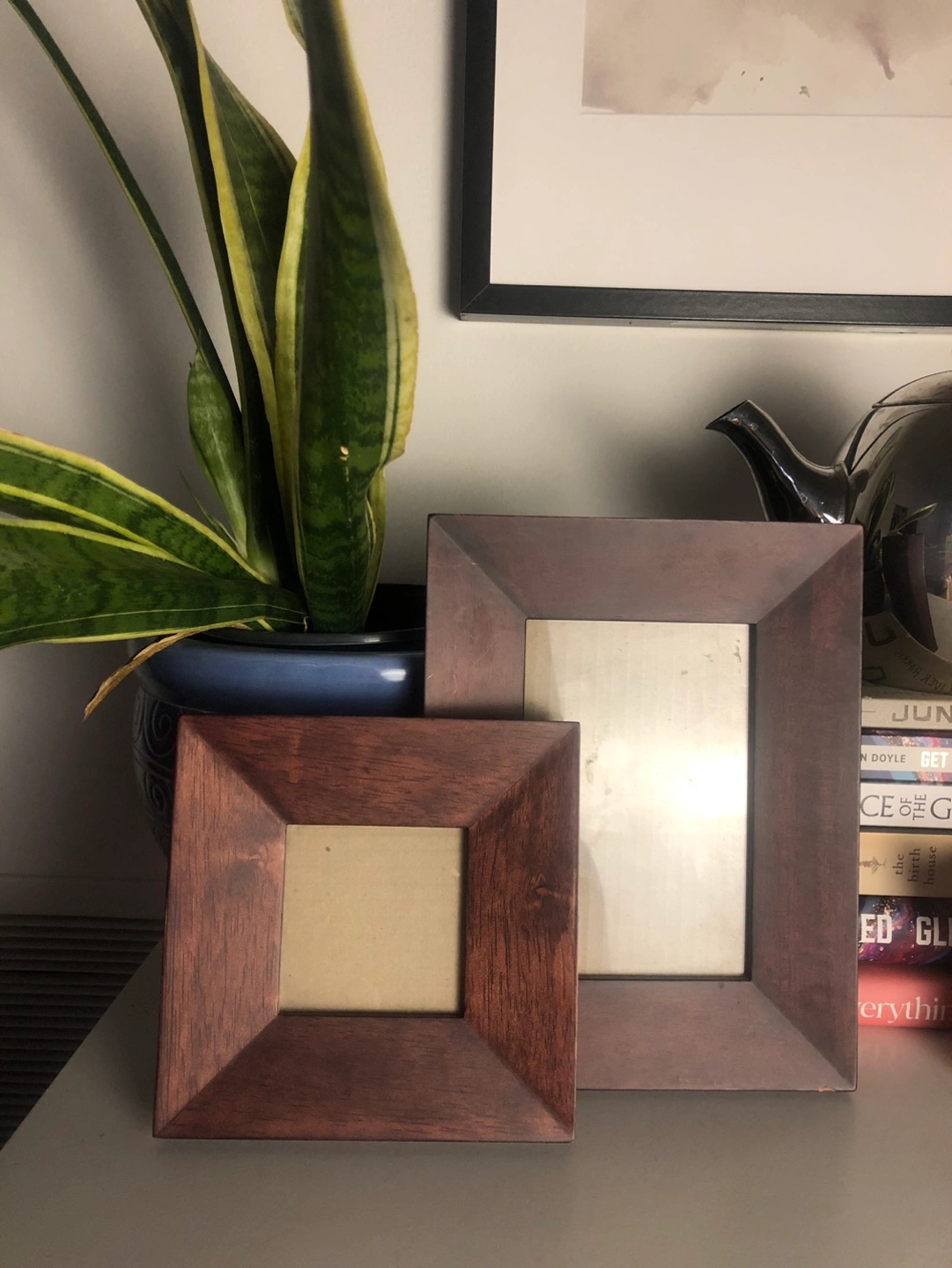 Set of two small square wooden picture frames. Dark brown stain. One frame is slightly smaller than the other.
