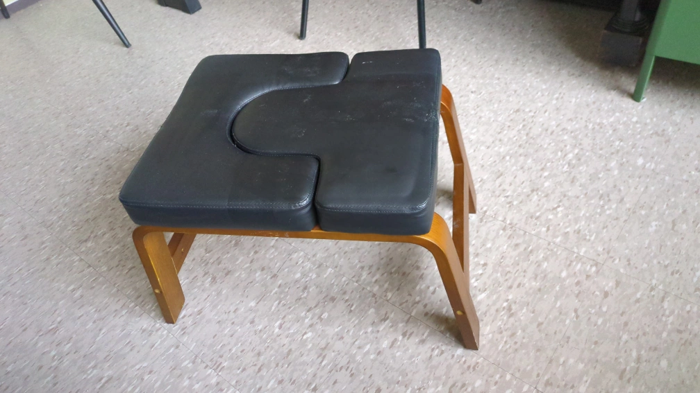 Black padded seat, wooden frame. Great for inversion maneuvers.