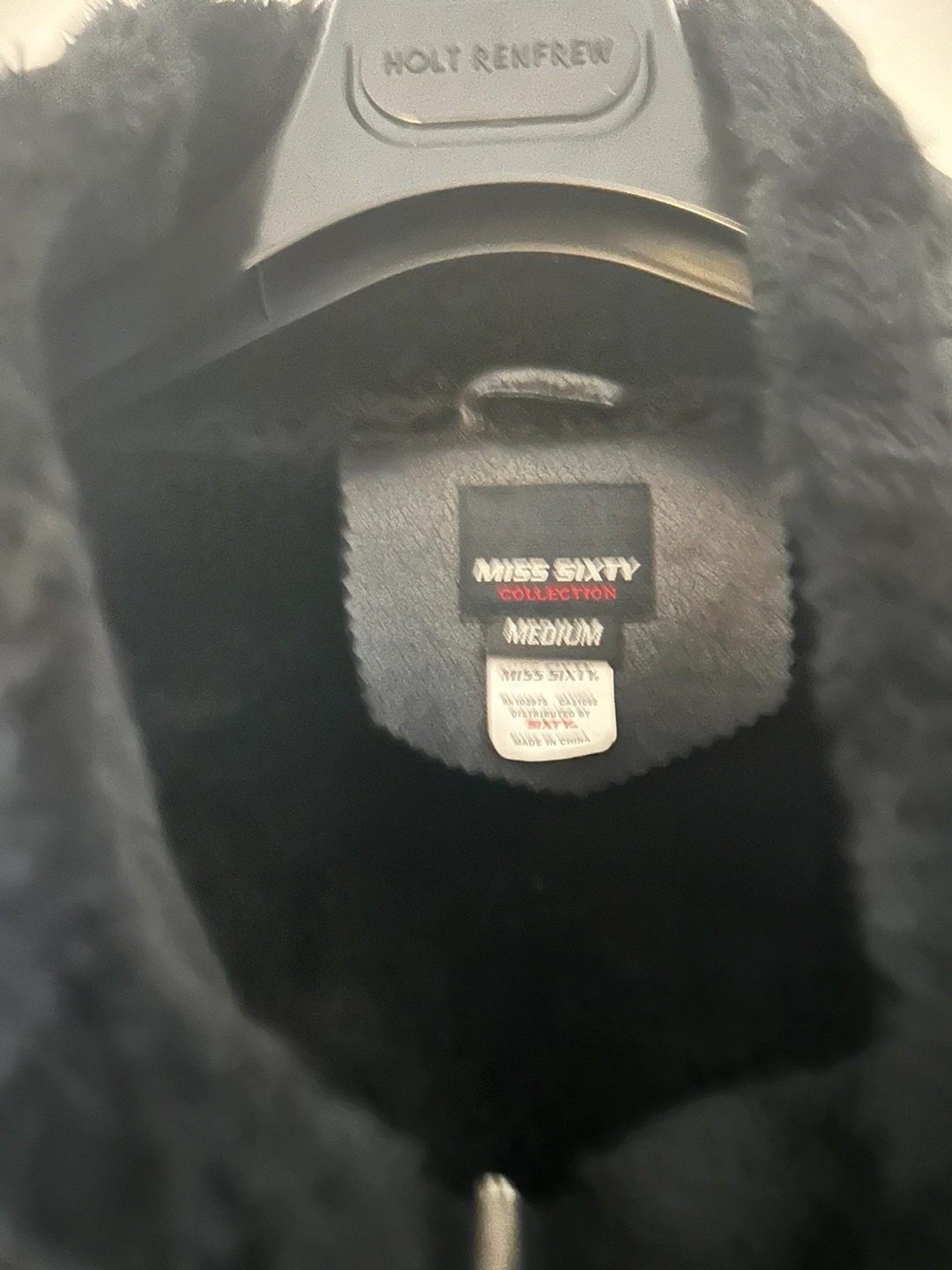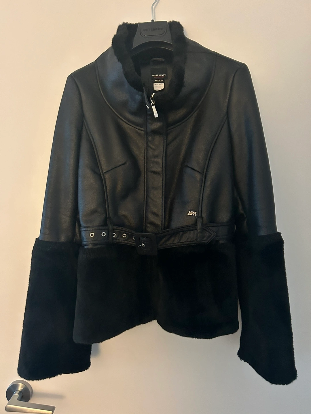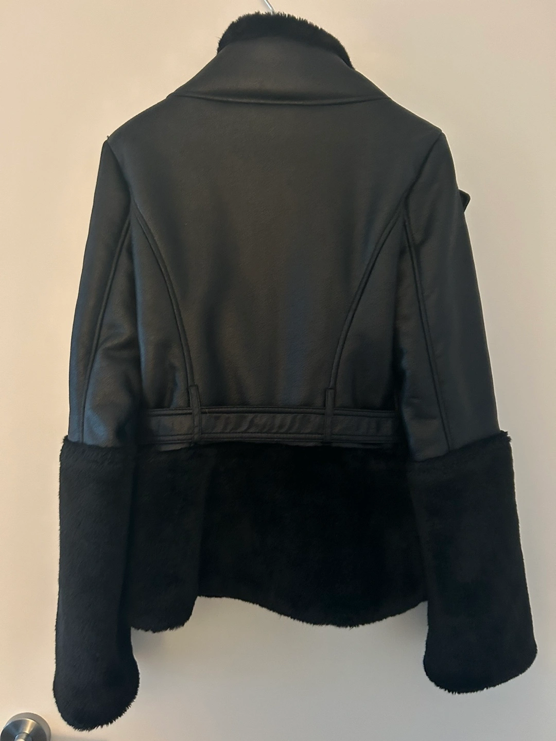 Black leather jacket with faux fur trim on the sleeves. The jacket features a belt and a zipper closure. Inside is lined with the same black faux fur. Like new, worn less than 5 times.