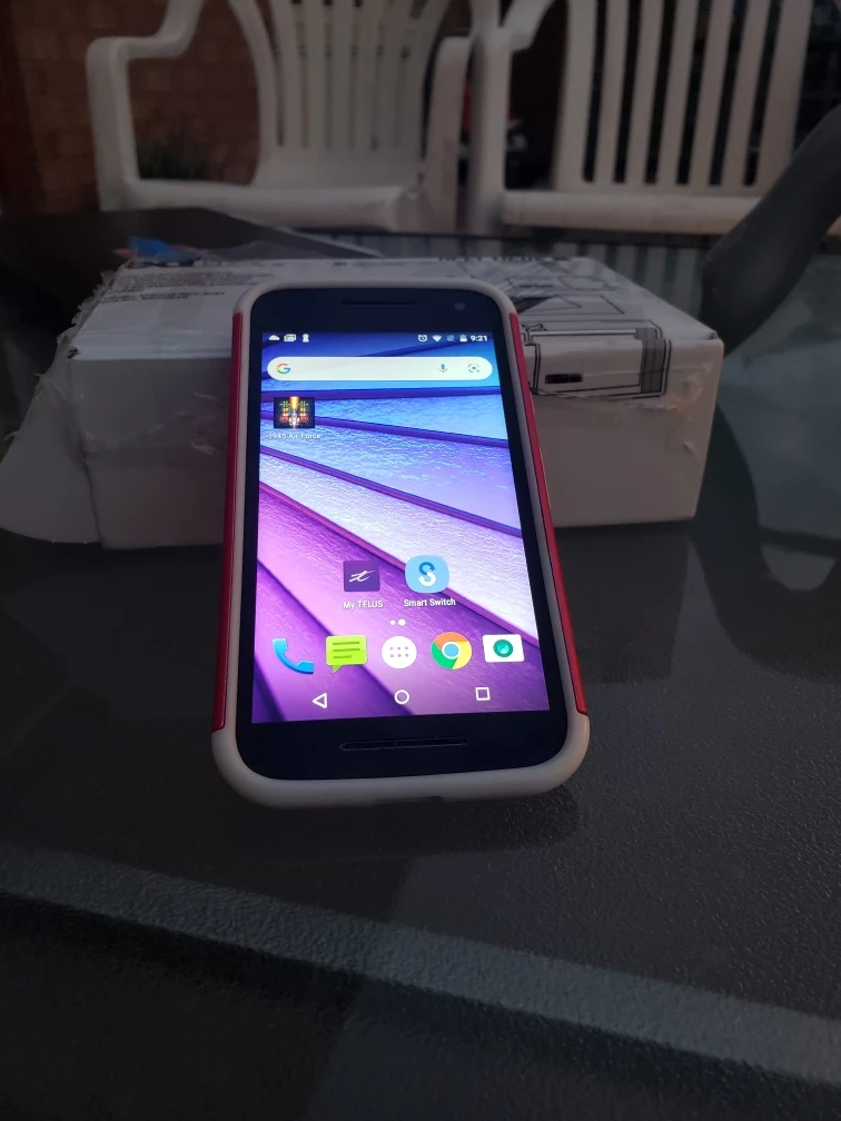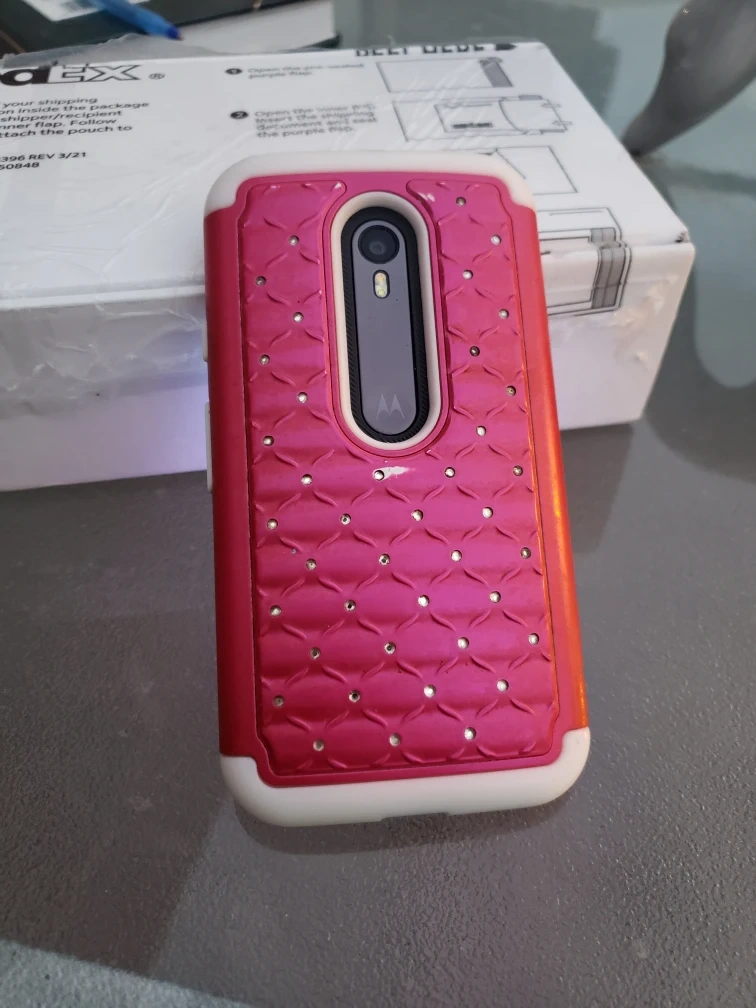 1. Motorola Moto G smartphone with original box and two cases. One case is black with red accents and the other is pink with rhinestones. The phone appears to be in good condition.