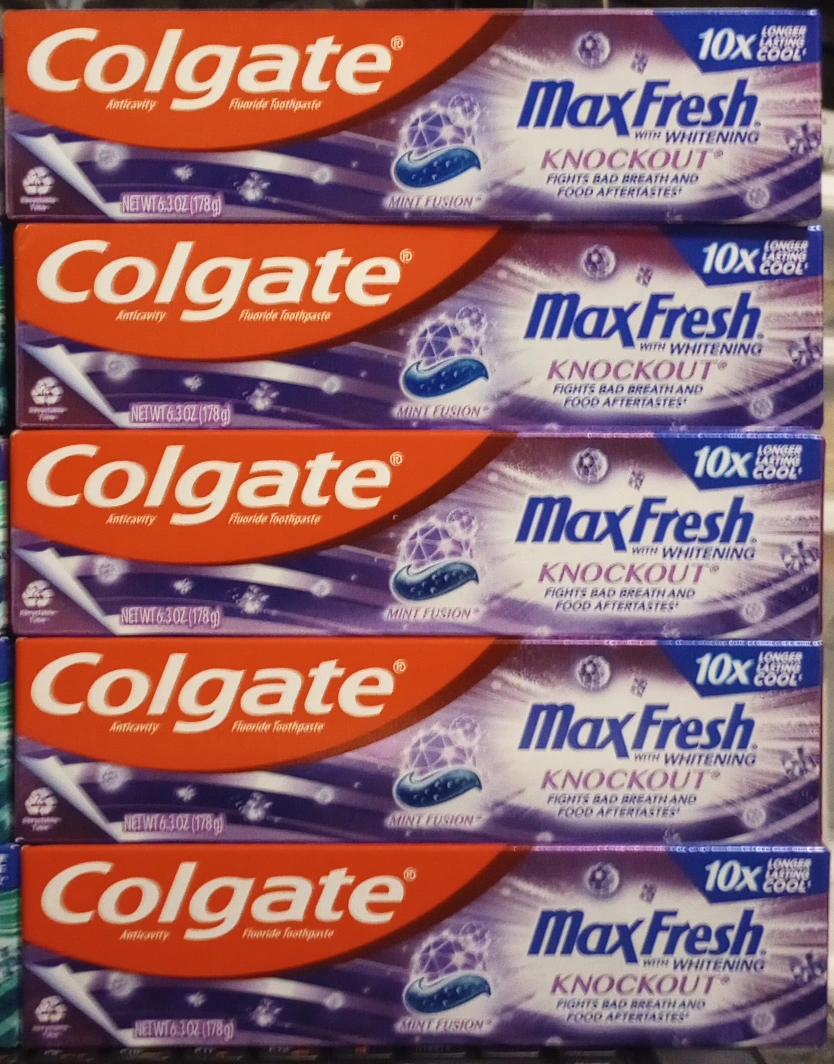 996Selling a set of 10 Colgate Max Fresh Toothpaste. Brand new in the box. Type: Knockout (Mint Fusion) Sz: 6-6.3 oz Qty: 10 tubes in box I also have... - Breath Strips (Clean Mint) - Breath Strips (Cool Mint) - Smart Foam (Effervescent Mint) Couponer clearing out my stockpile Only available for pickup **Check out my other listings and build a large bundle for delivery; minimum for delivery is $70