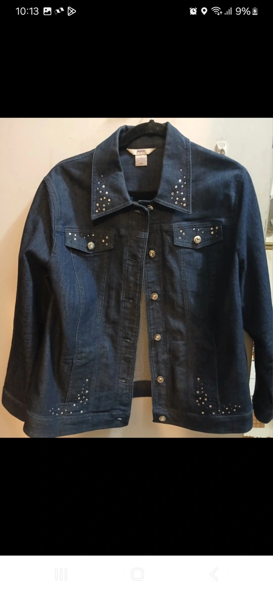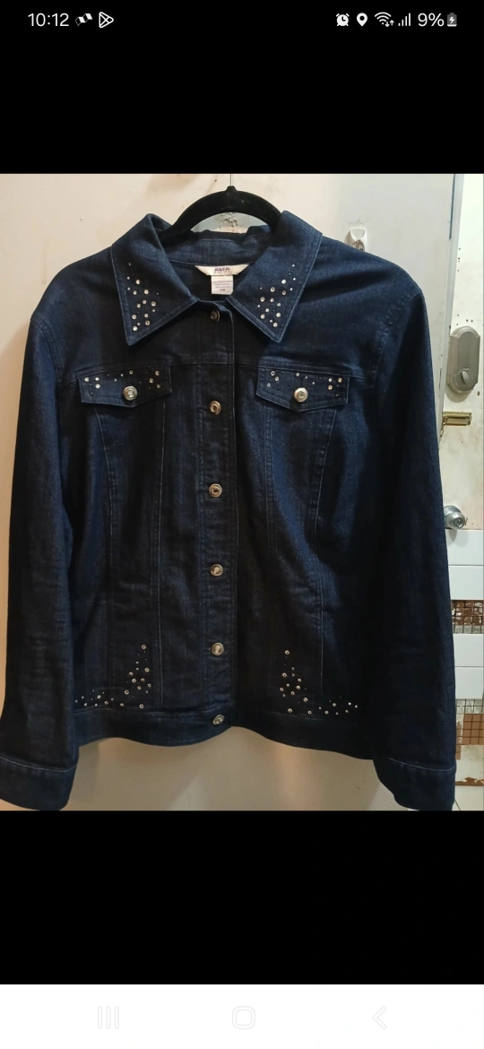711Blue denim jacket with rhinestones on the collar and front. Long sleeves with button cuffs. Button closure. Pockets on the front. Like new. Excellent condition. Available for pickup at 2401 Queen Street East. For a quicker response 437-577-2614. Can be shipped/delivered for an additional fee.