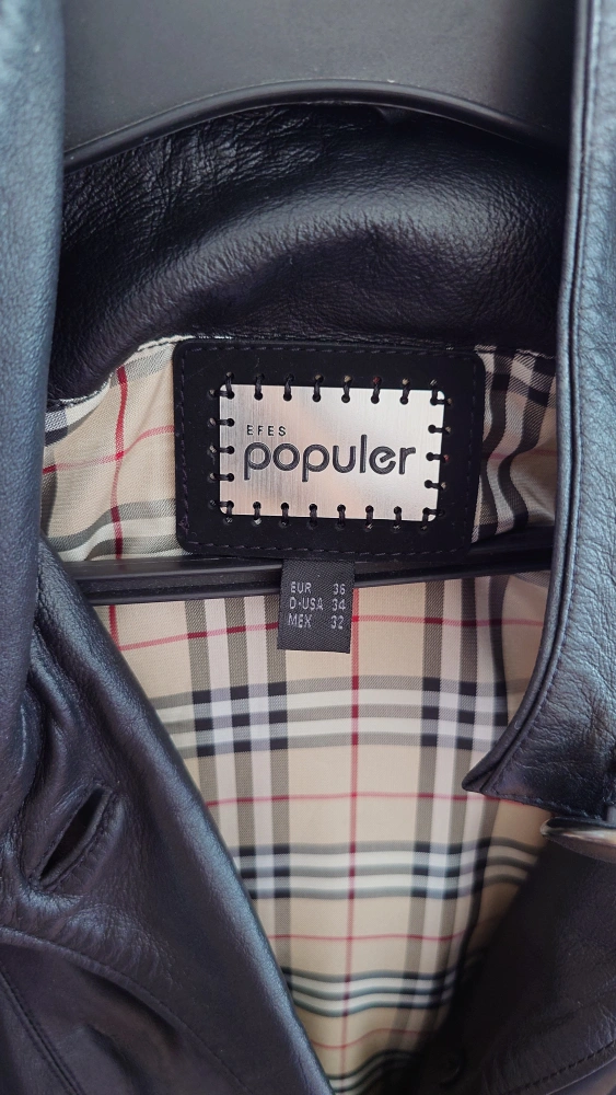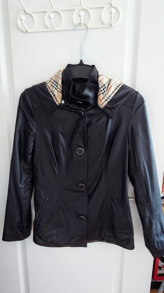 Genuine leather jacket with a hood. Features a Burberry-like plaid lining. Sleeves can be rolled up with button closure for a different style. Just been professionally dry-cleaned