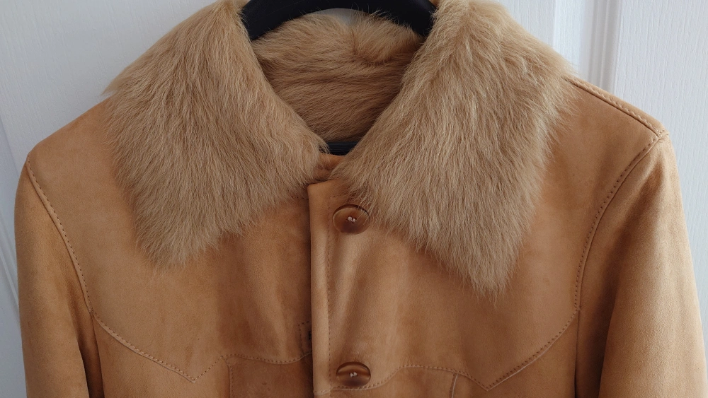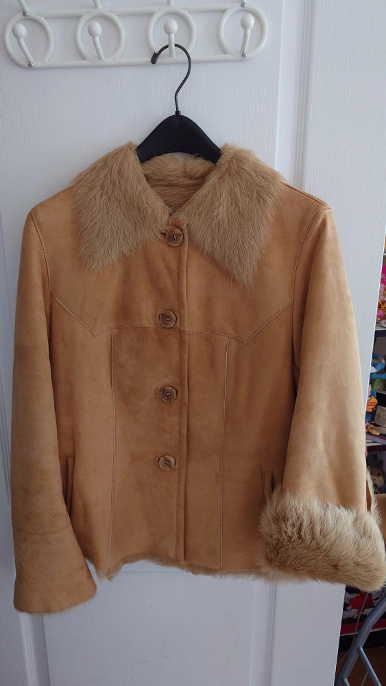 Shearling sheepskin with the wool on one side and the tanned (= treated) skin on the other, cuffs can be rolled up for another style. Just been professionally dry-cleaned. Made in Italy.