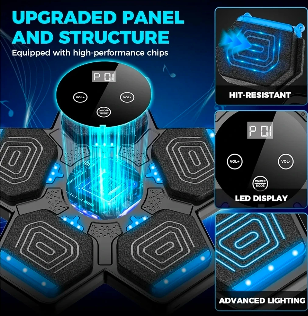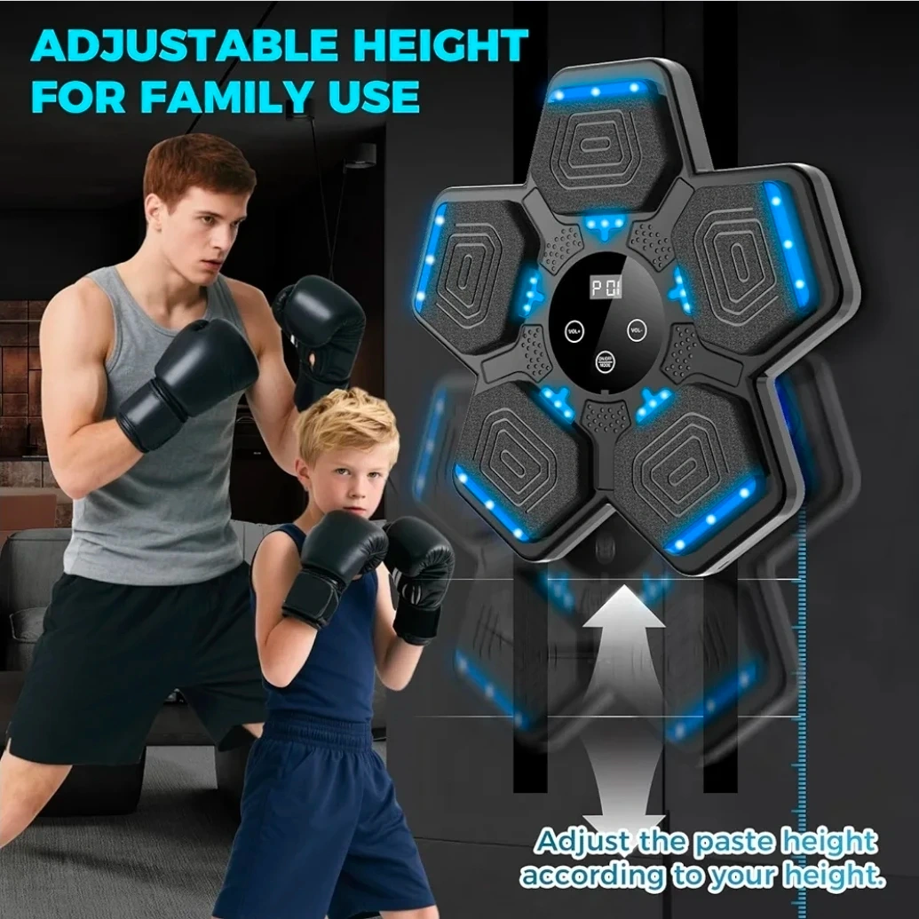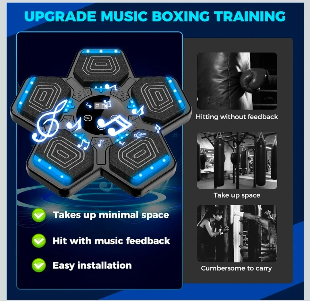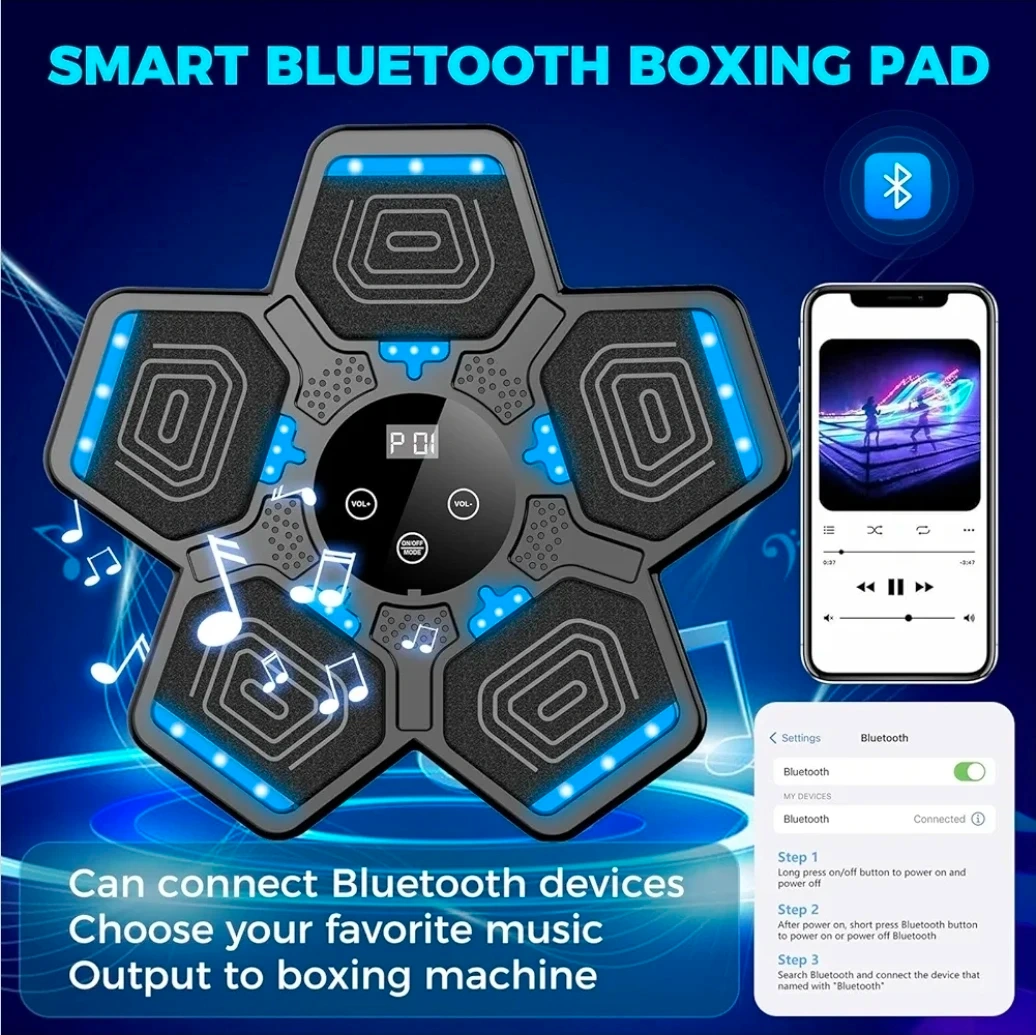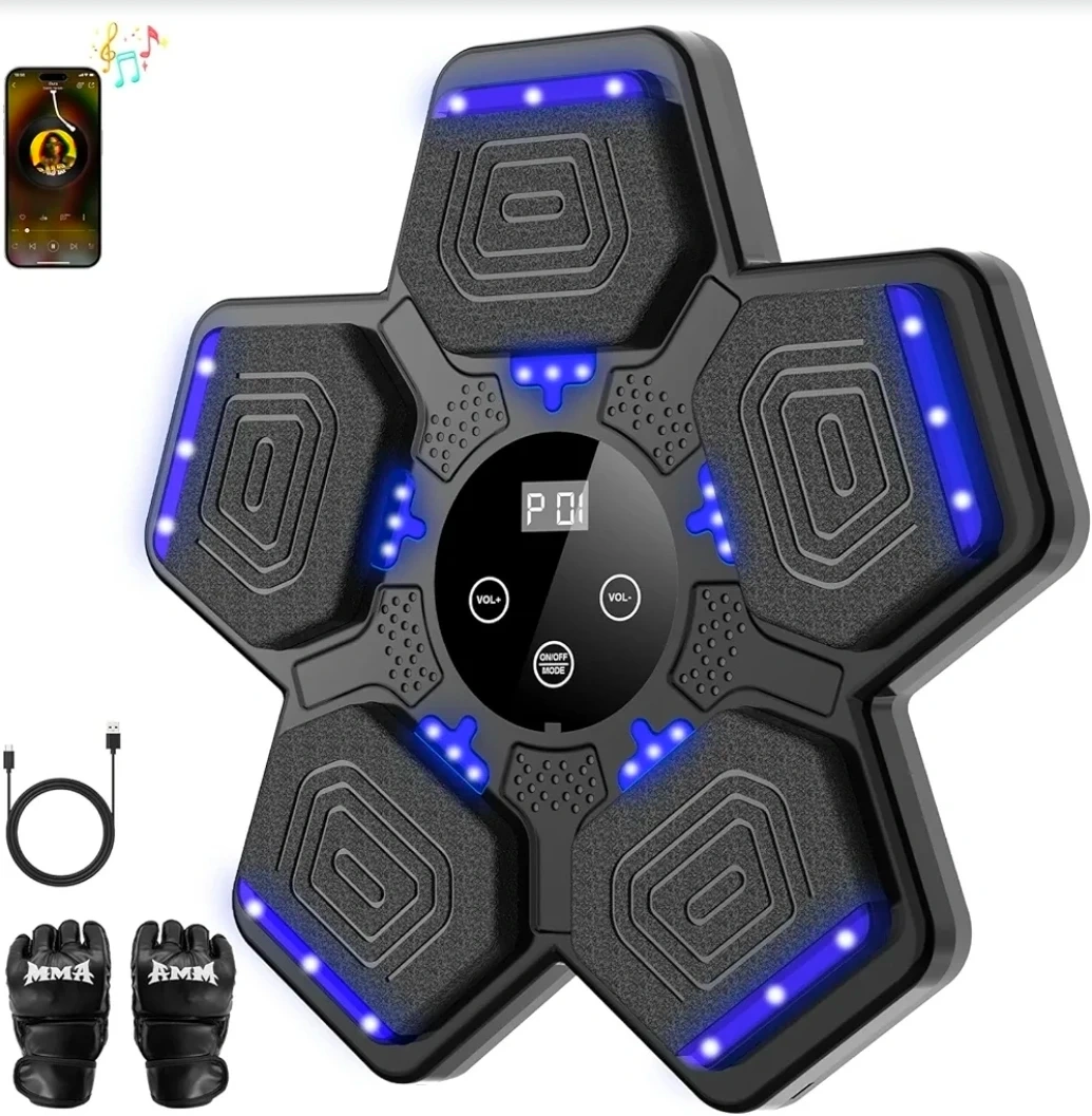 This smart music boxing pad connects via Bluetooth for your favourite music. It's designed with hit-resistant materials and features advanced lighting with LED display. The pad has a size of 13.9 inches wide and 1.57 inches thick.