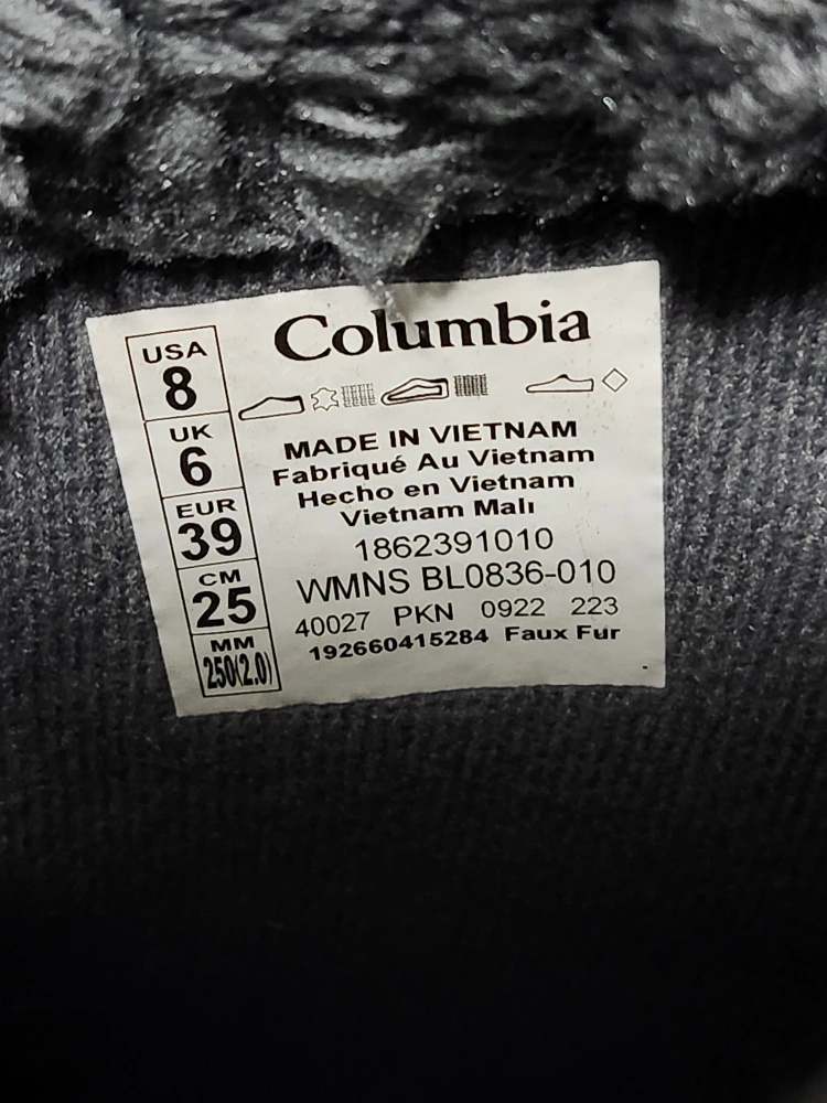 Columbia women's snow boots in black, size 8. They're quilted with faux fur lining and feature a waterproof design. Perfect for keeping your feet warm and dry this winter!