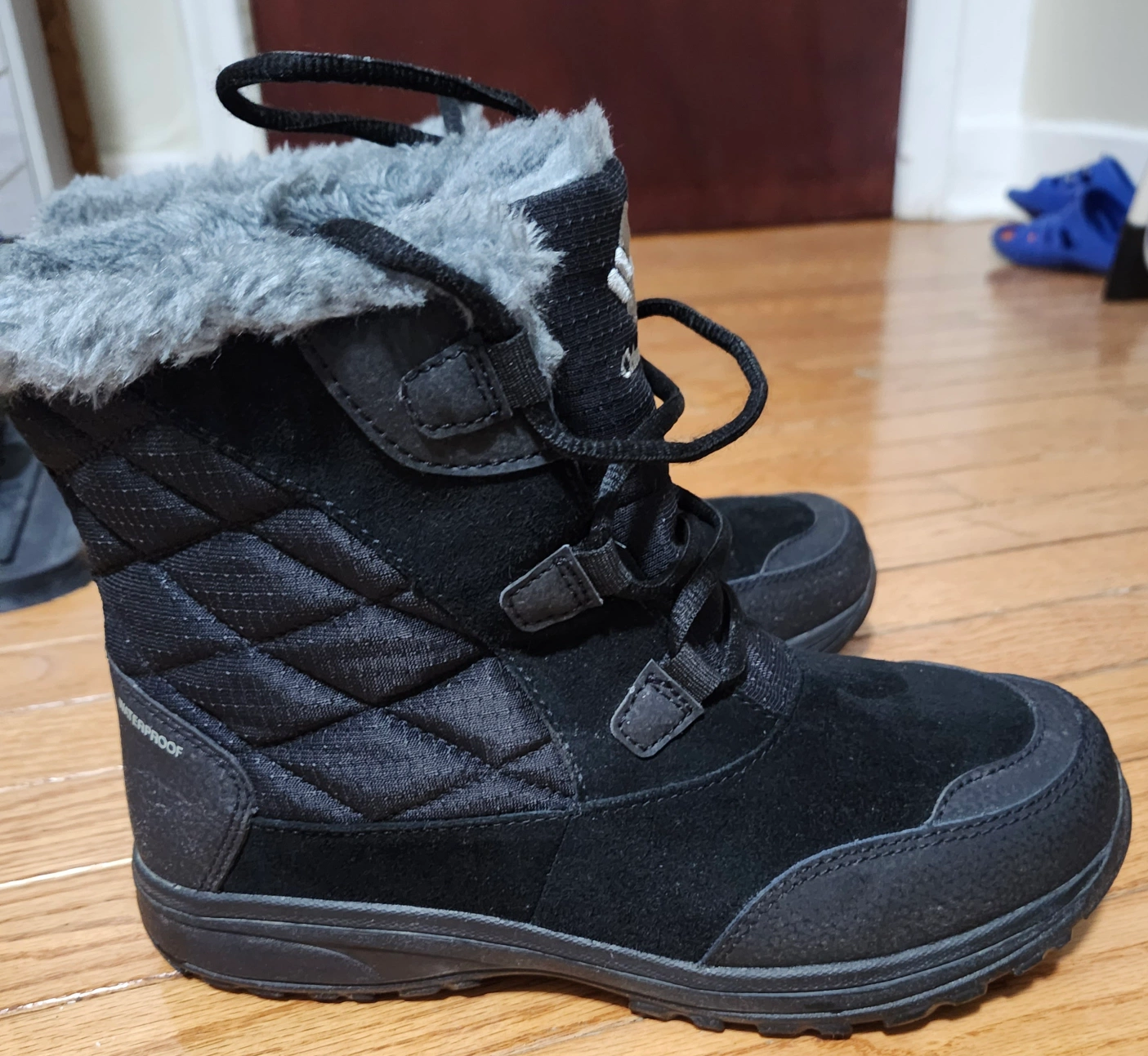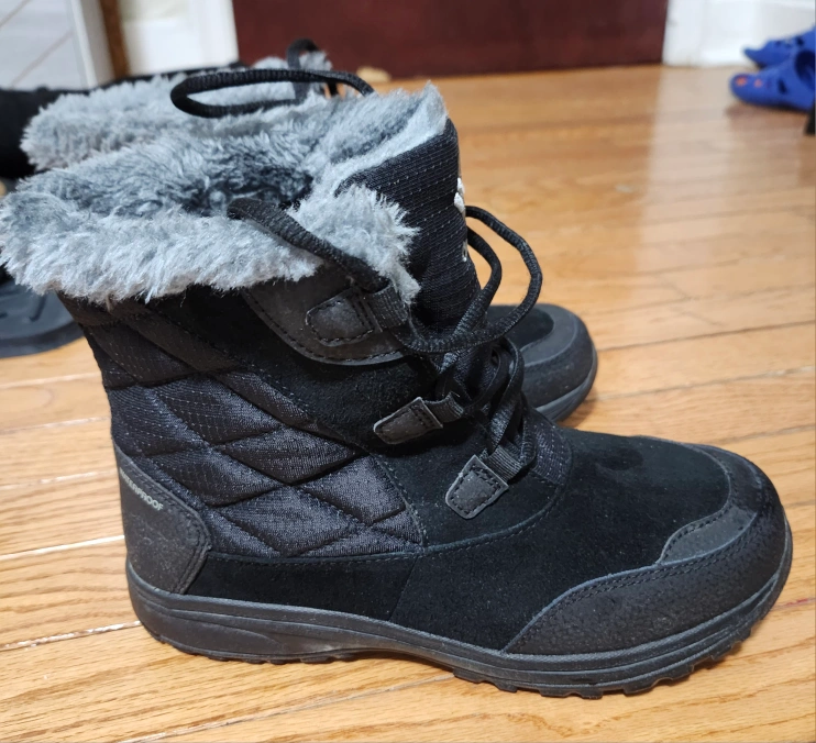 Columbia women's snow boots in black, size 8. They're quilted with faux fur lining and feature a waterproof design. Perfect for keeping your feet warm and dry this winter!