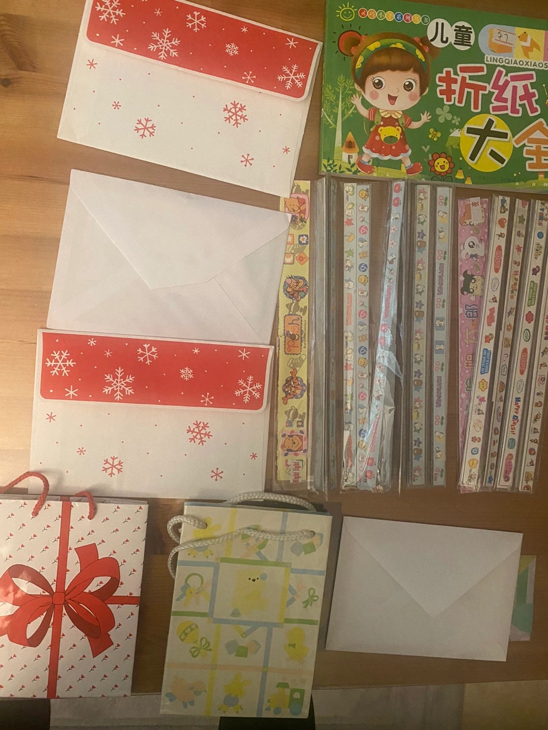 A bundle of origami paper, books, and supplies. Includes envelopes, cards and a gift bag.