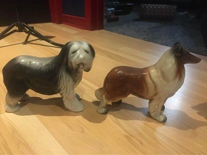 Set of two ceramic dog figurines. One is a Collie and the other is a Sheepdog. They are both in good condition and would make a great addition to any collection.