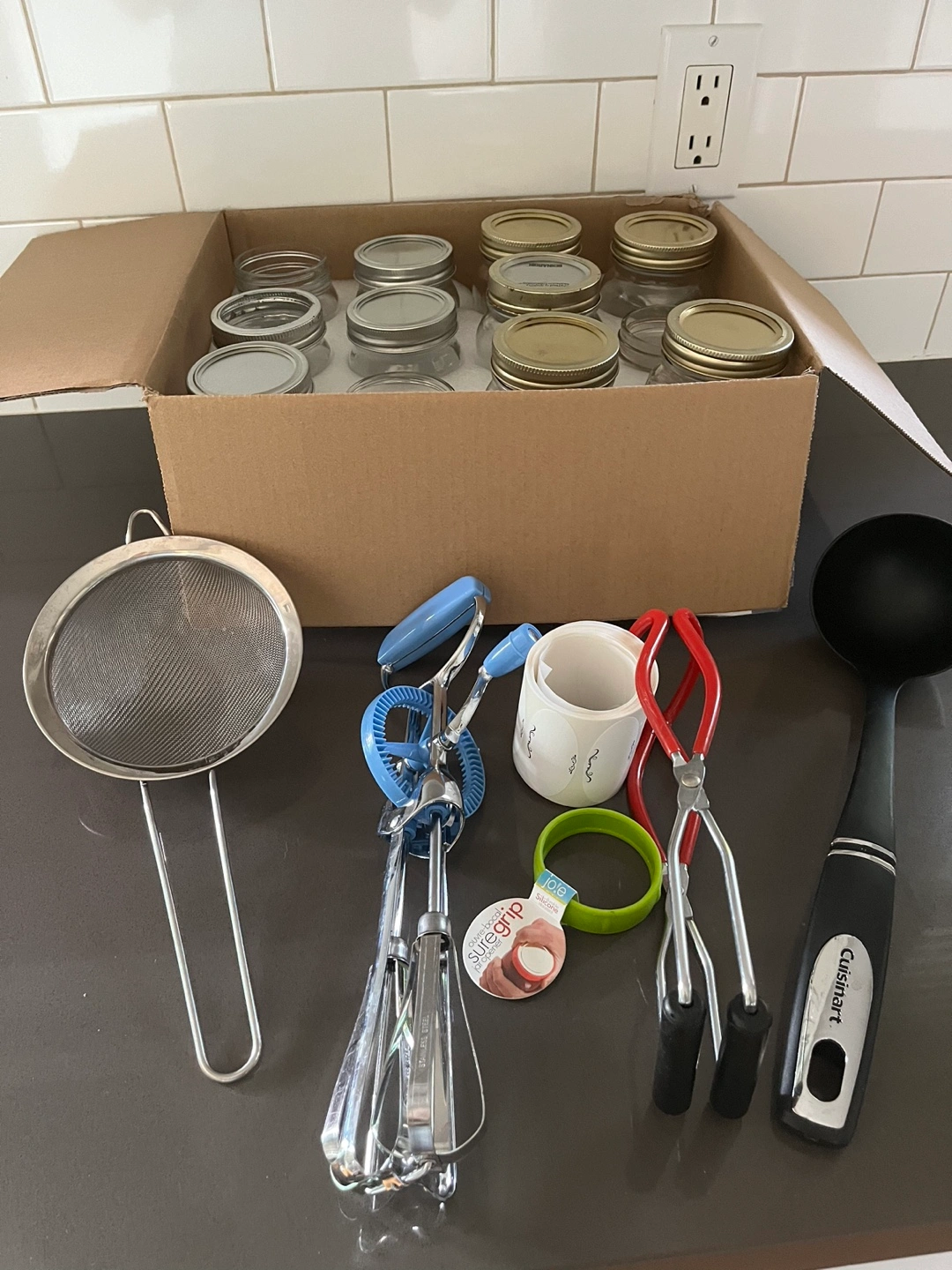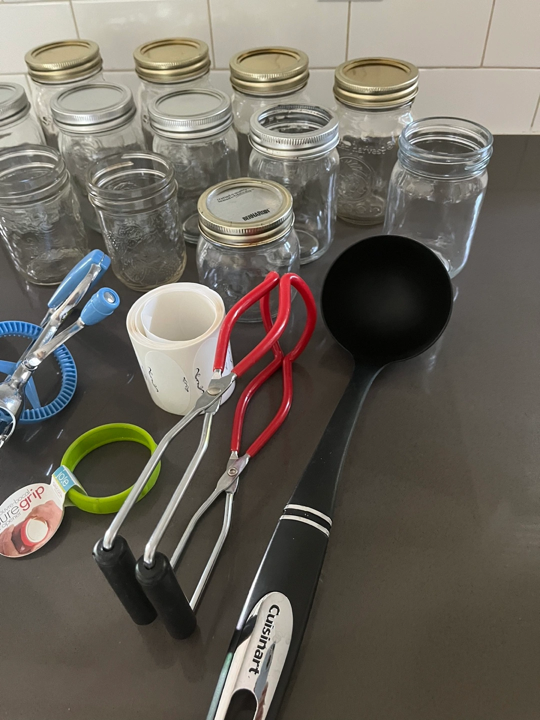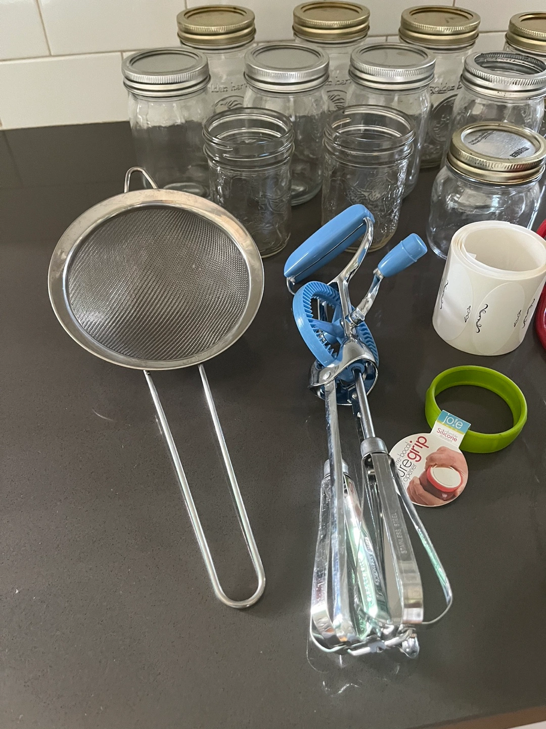 Canning kit including 12 different size glass jars, some are missing lids and rings, Jar lifter, a jar lid tool, a ladle, a strainer and a whisk. Includes a roll of labels. Price is for everything, pick up in Utopia