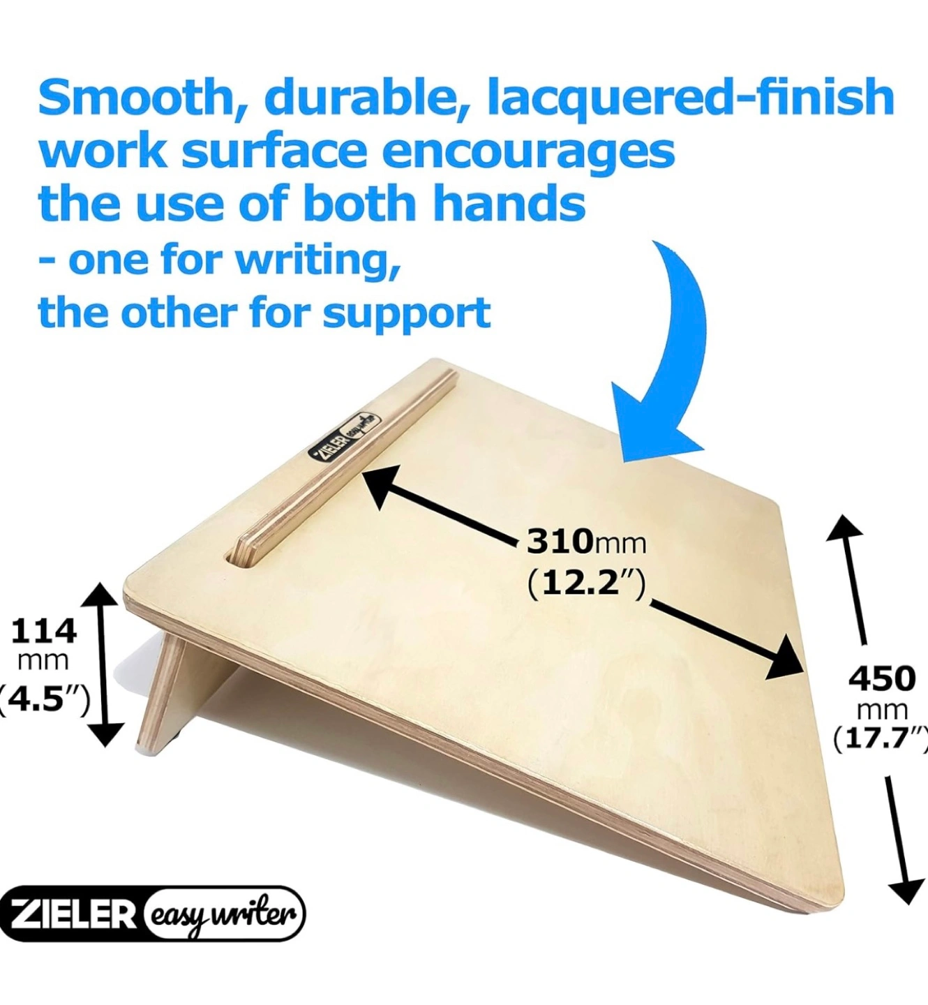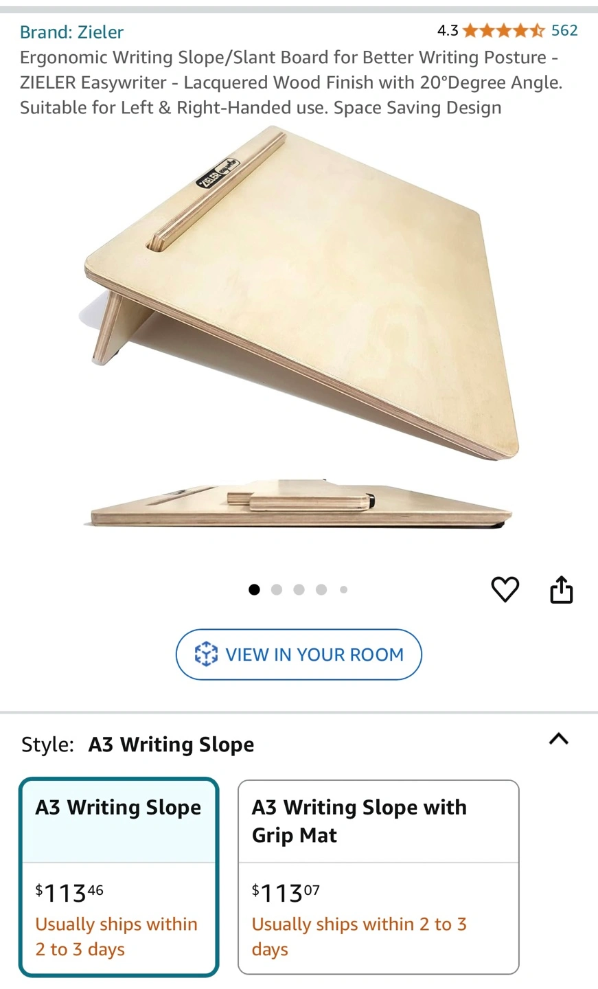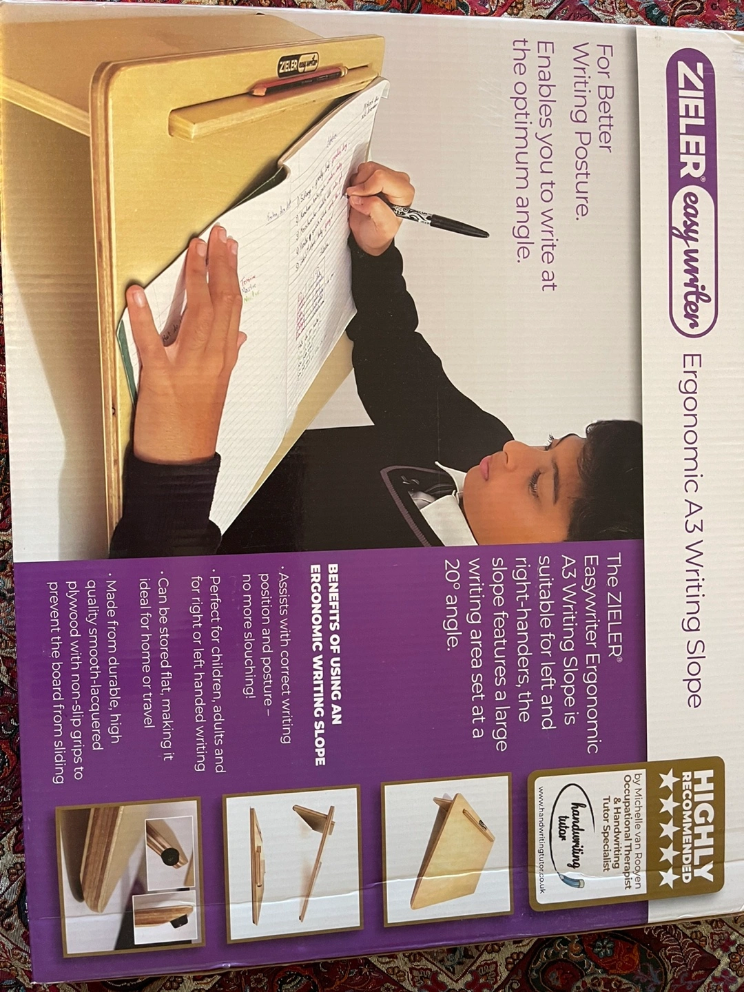 323Ergonomic Writing Slope /A3 Writing Slope/Slant Board for Better Posture. ZIELEr Easywriter - Lacquered Wood Finish with 20 Degree Angle. Suitable for Left & Right-handed use. Space Saving Design. See the pictures for more details. Never used brand new in the box.