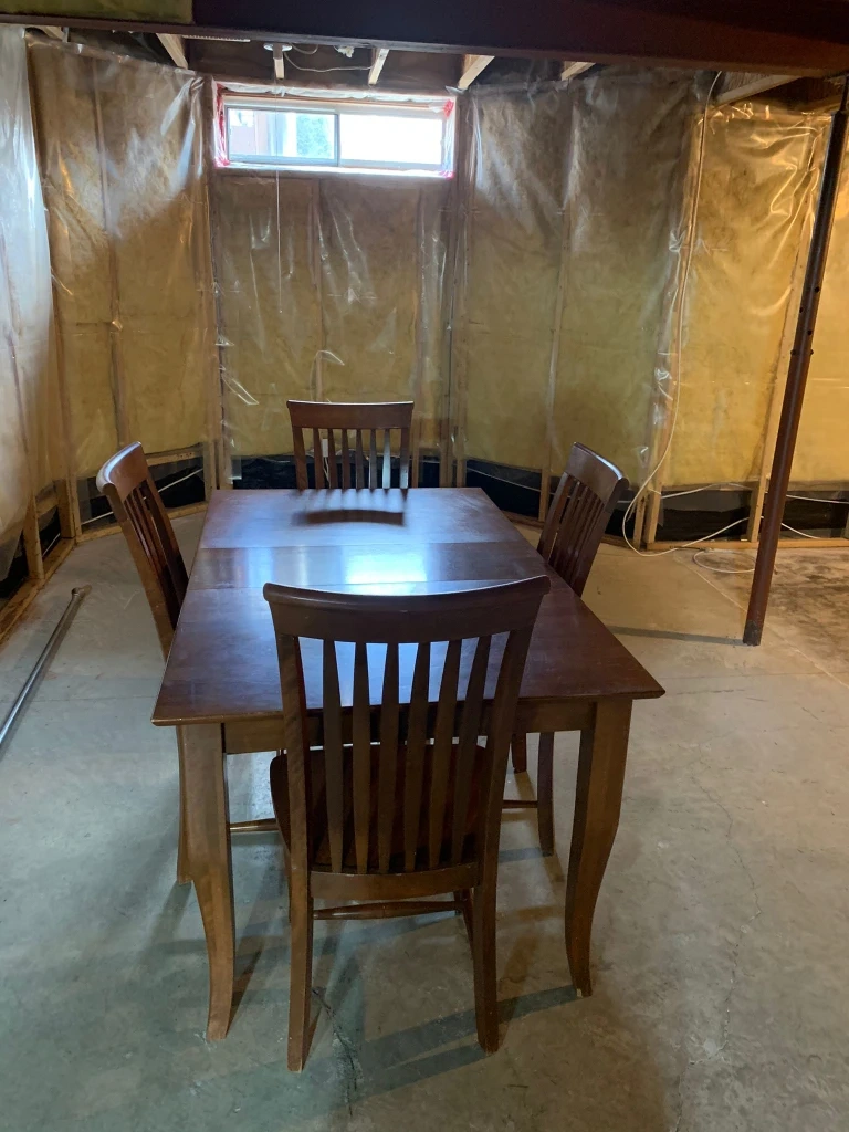 Wooden dining table and four chairs. Table has a leaf. Chairs have slatted backs. In good condition