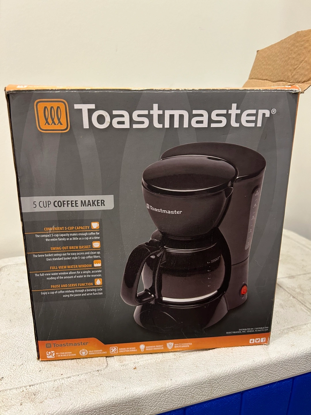 Black coffee maker, like new, used a couple times before purchasing a larger one. 5 cup capacity, swing out brew basket, full view water window, auto shut off, and keep warm function.