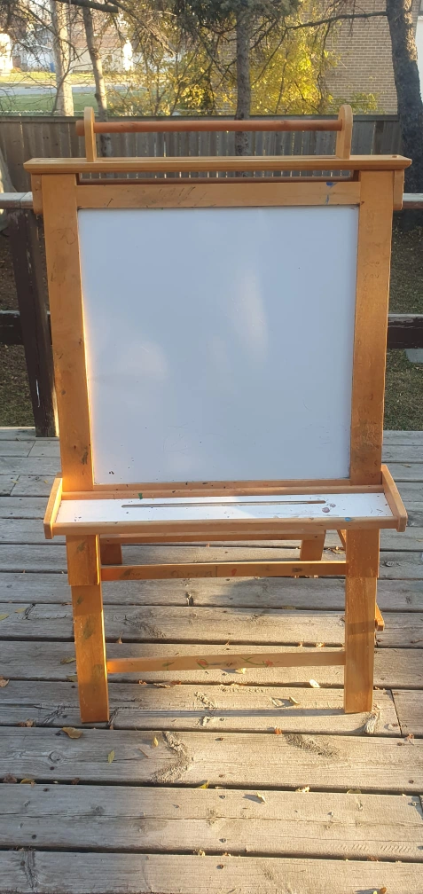 Wooden easel with a white surface and a tray underneath. Includes a roll-up paper holder. The easel folds for storage.