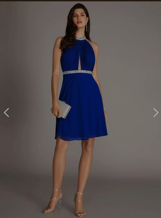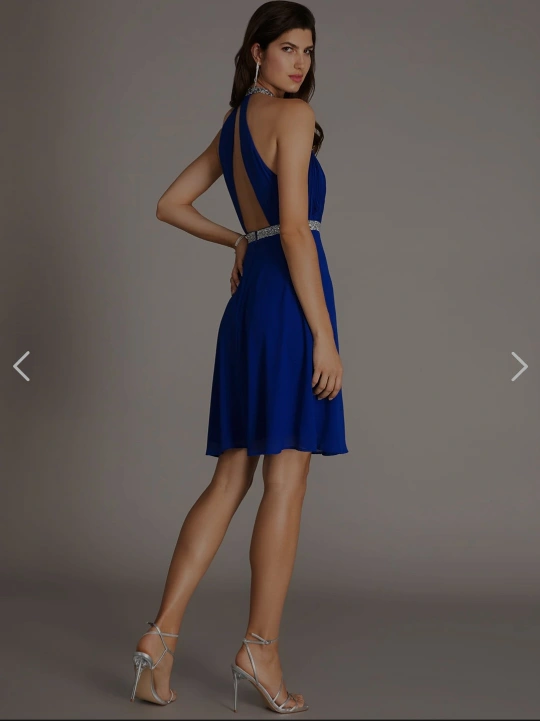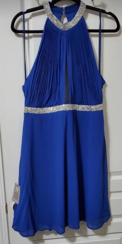 Beautiful blue dress with a halter neckline and embellished waist. Flowy and flattering. Front deep Key hole, open back. Front lenght 41 inches. Bust 39.5 - 41". Waist 32-33.5". Hip 42.5-44".