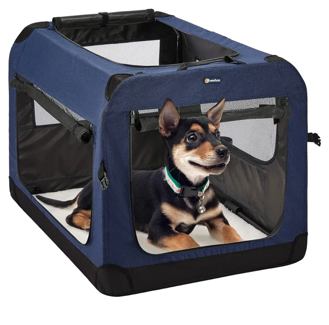 Veehoo Folding Soft Dog Crate, 3-Door Portable Collapsible Pet Kennel for Crate-Training Dogs, 5 x Durable Mesh Screen, 600D Cationic Oxford Fabric, Indoor & Outdoor Use, 20", Dark Blue