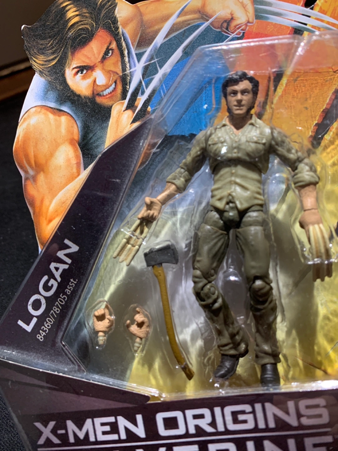 Wolverine action figure from X-Men Origins: Wolverine. Hugh Jackman version. Includes an axe and interchangeable hands. Figure is in the original packaging. Bone claws!