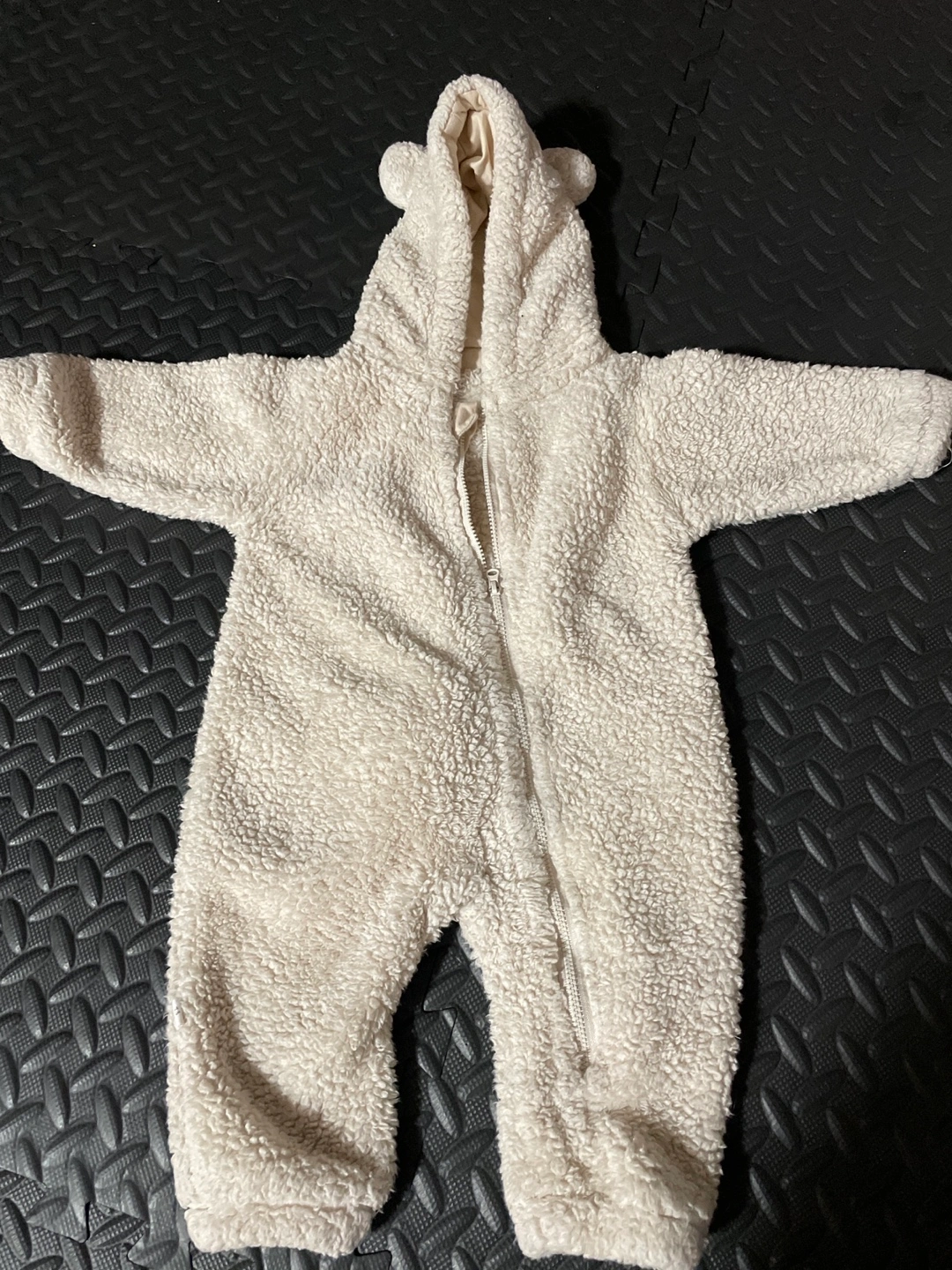Soft and cuddly baby onesie with bear ears and tail. Zipper closure. Great for keeping baby warm.