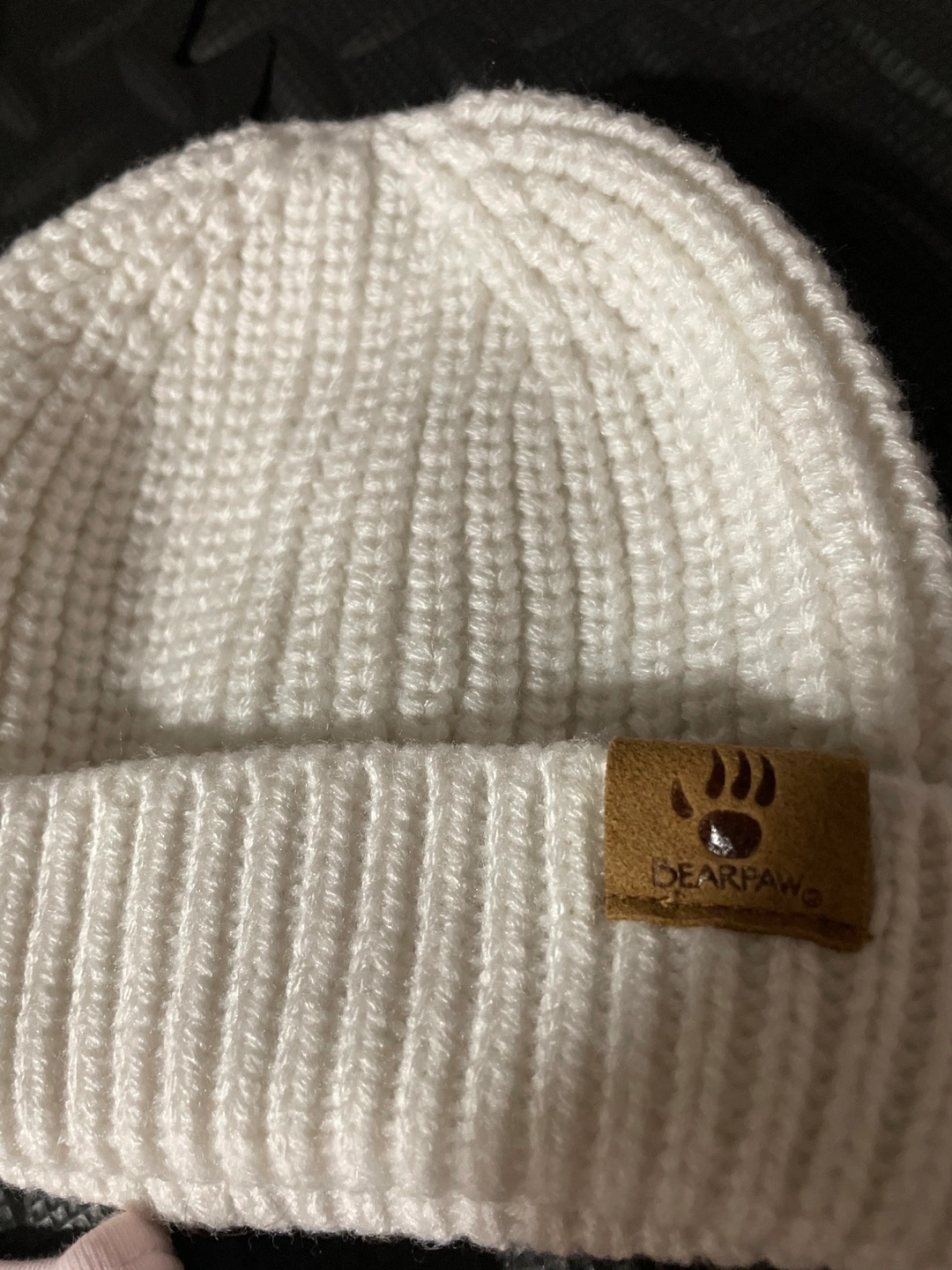 Pink onesie with bunnies and rainbow embroidery. Two knit hats with pom-poms, one pink and one white.