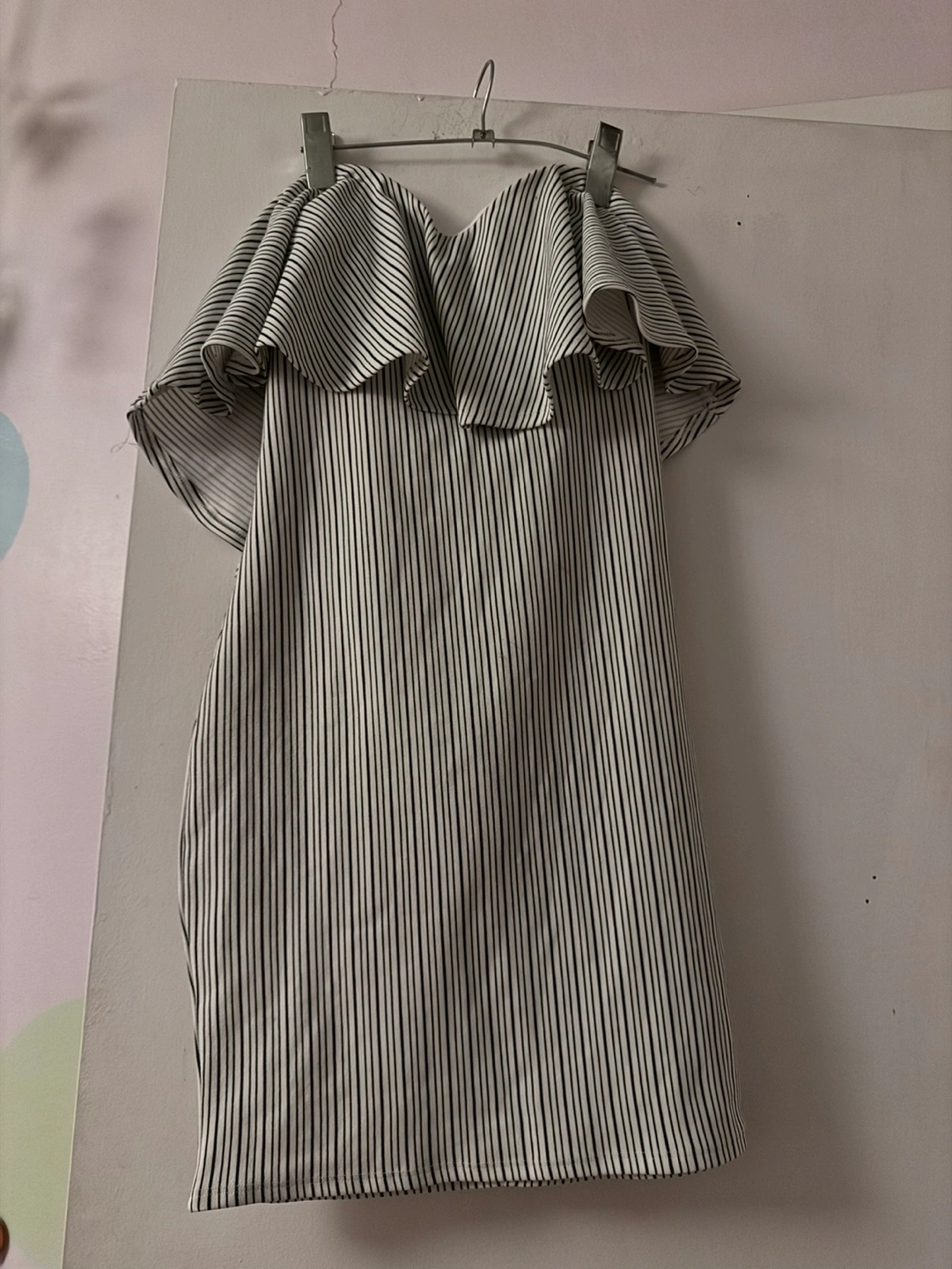 White and black striped off-the-shoulder dress. Ruffled neckline and fitted bodice. Size medium. Zipper closure in the back.