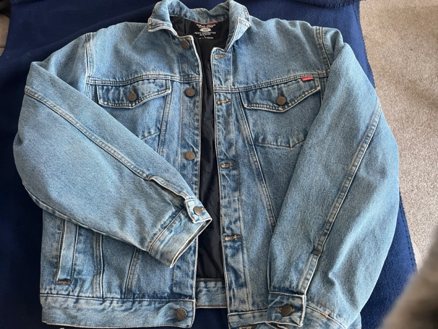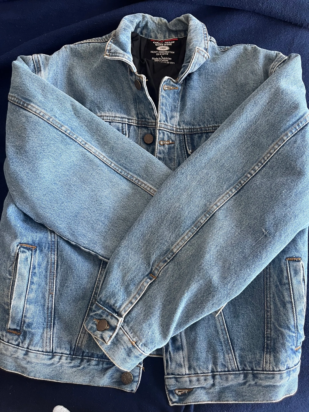 Blue denim jacket, long sleeves, button closure, two front pockets, two chest pockets, lined. Women’s jeans jacket in a good condition size L thick and heavy very good for the winter keeps you warm and stylish