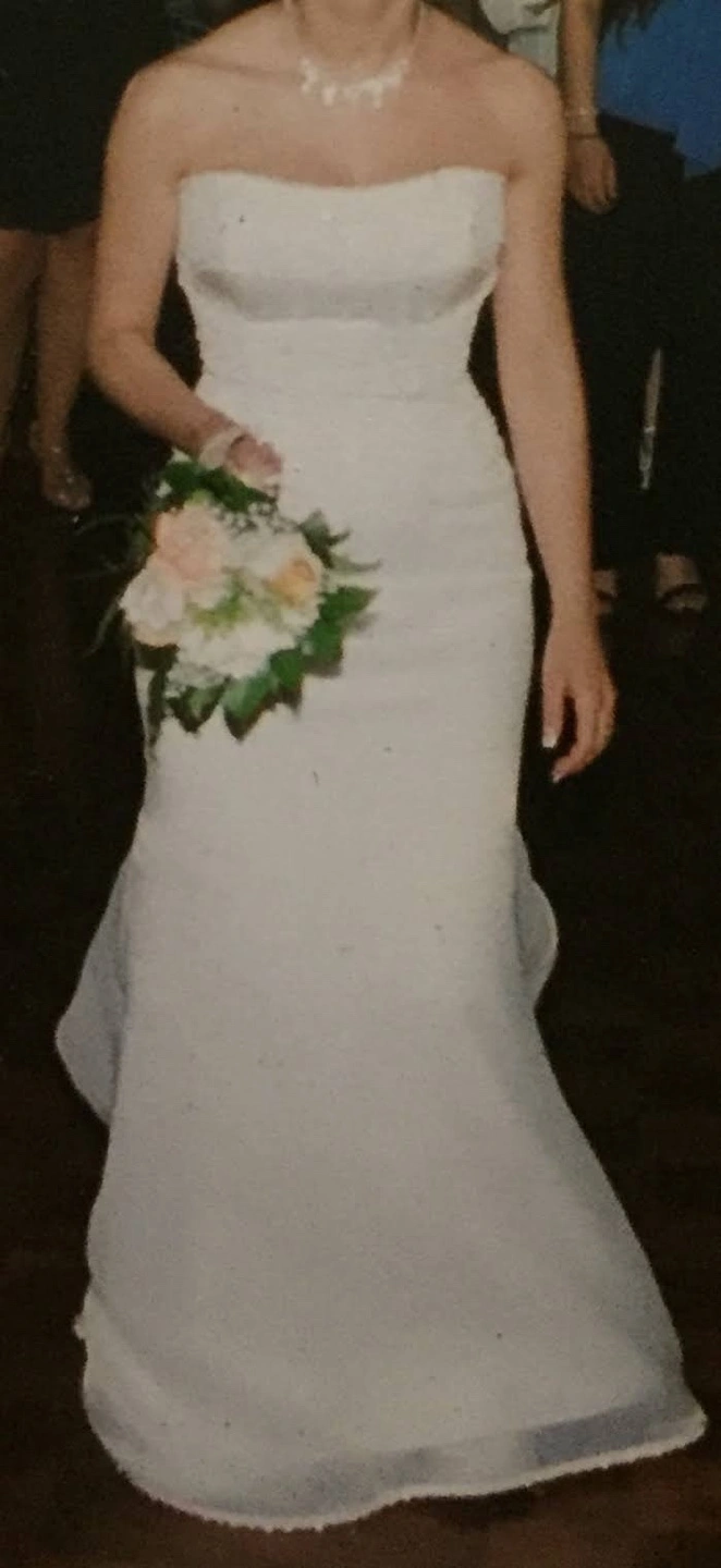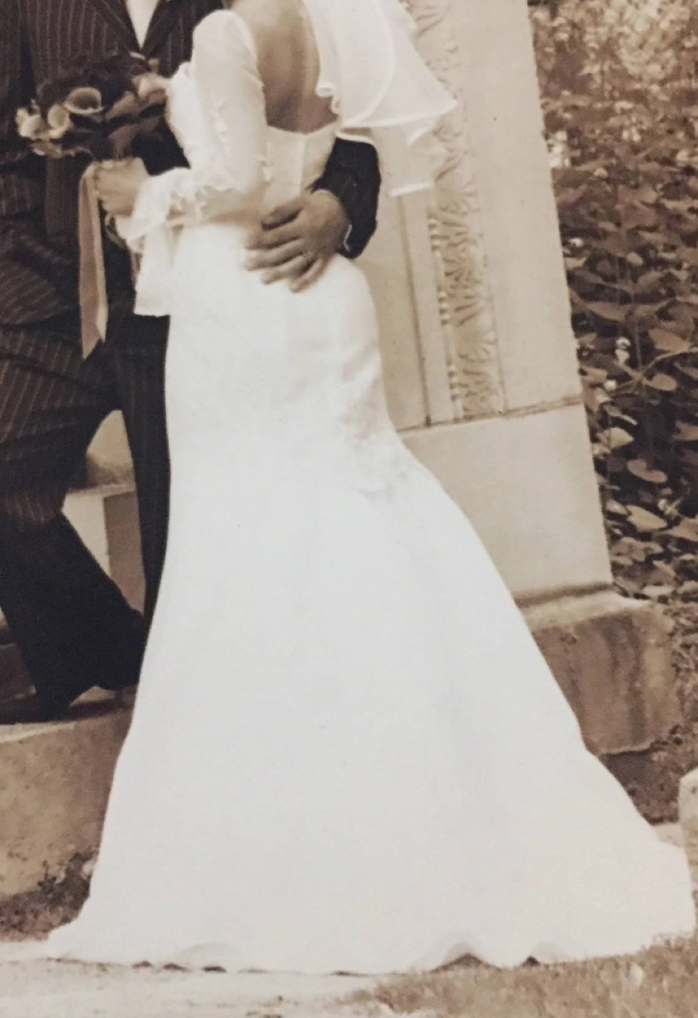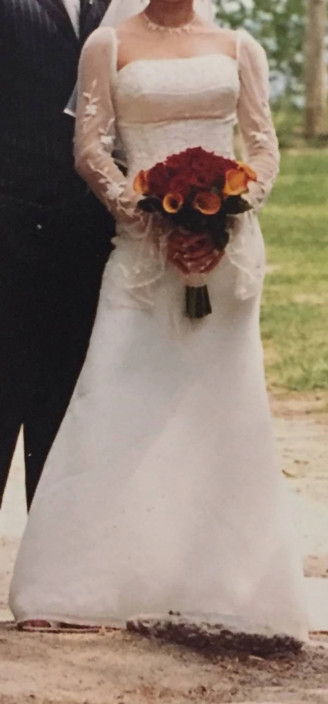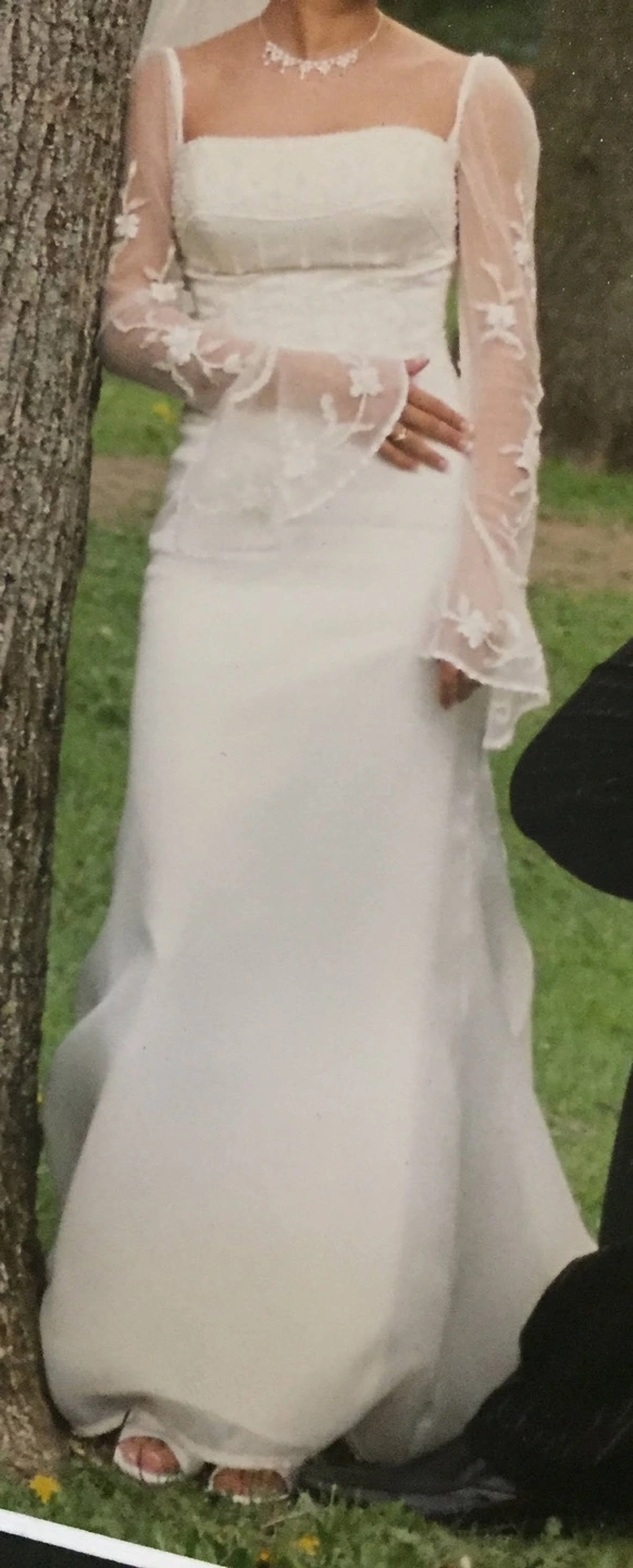 Wedding dress with removable long lace sleeves and a fitted bodice. It has a flowing skirt with a train. The dress is in excellent condition and has been professionally cleaned.
