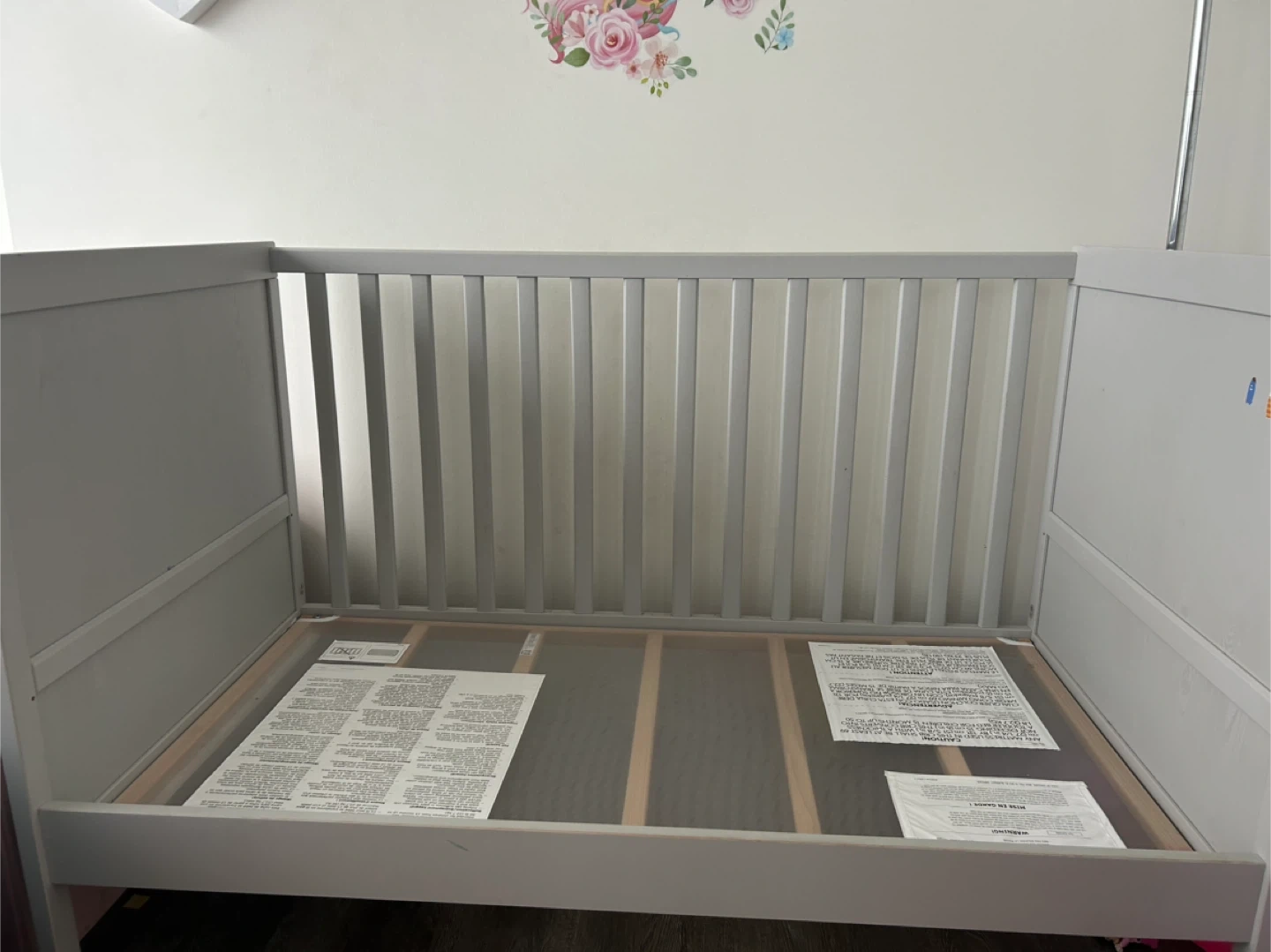 I'm giving away my daughter's crib (white with slatted sides). It's in good shape and comes assembled ( Mattress not included).This is an IKEA SUNDVIK crib in gray. It's 76 cm wide and 138 cm long. The crib is suitable for toddlers.