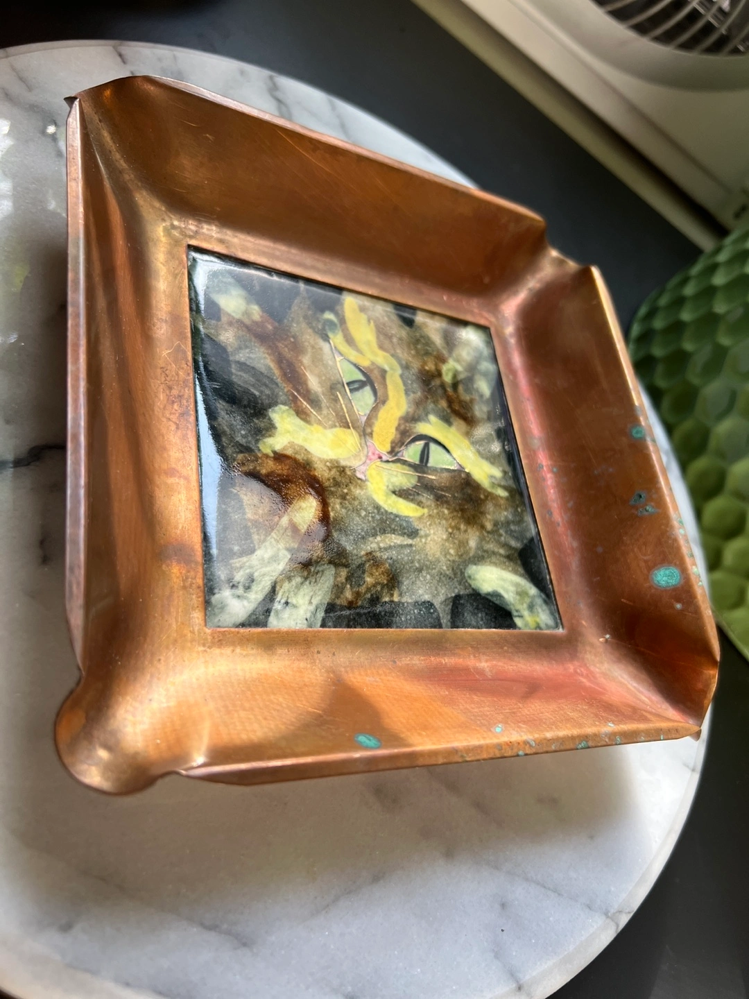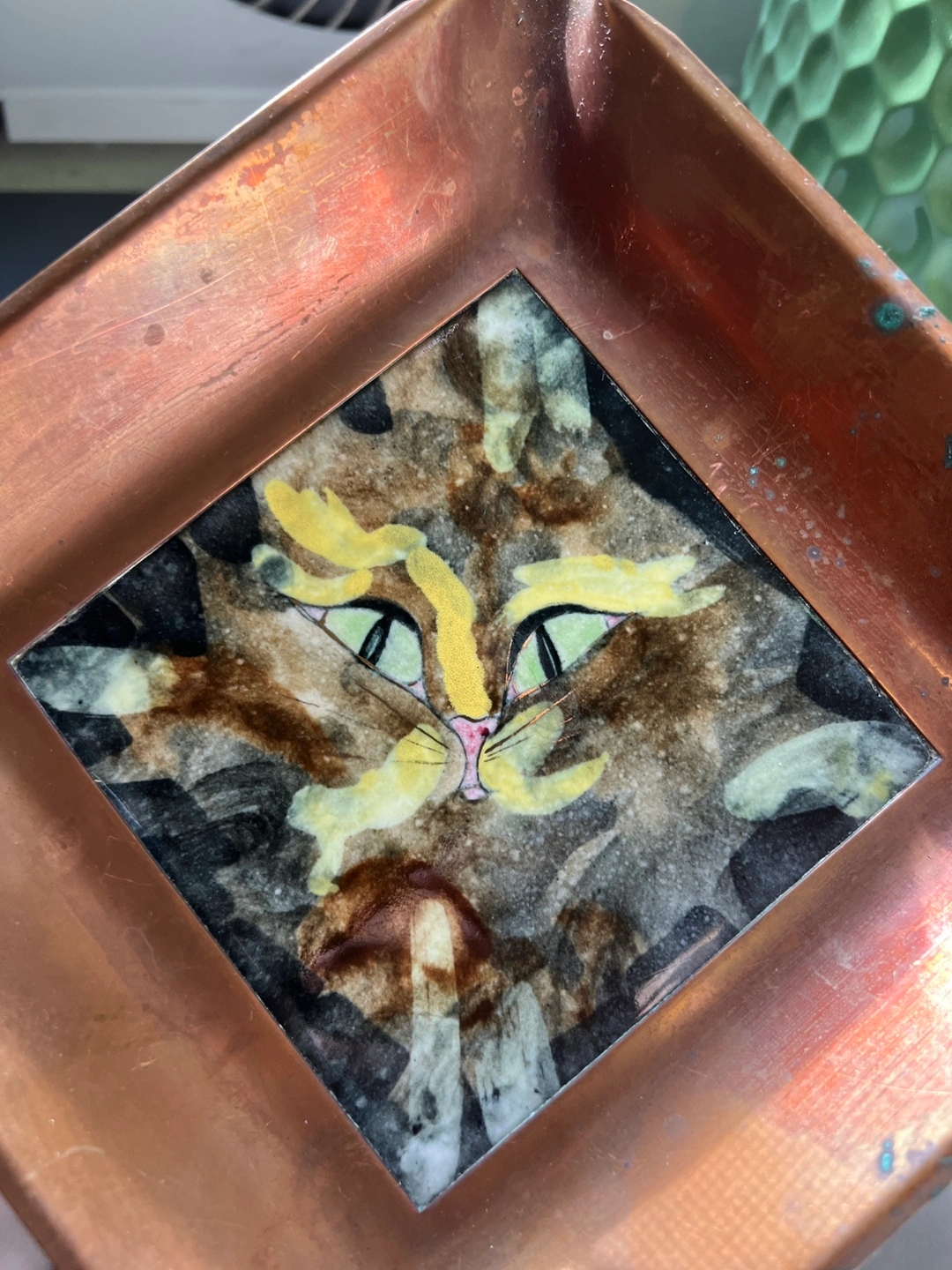 1970’s copper and ceramic folk art with a cat portrait on ceramic with gold overpainting.