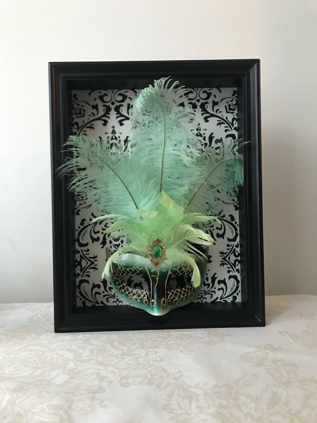 610Venetian mask with green feathers and gold accents was added by myself and can be removed. Shadow box frame retails for $20 Pick up only
