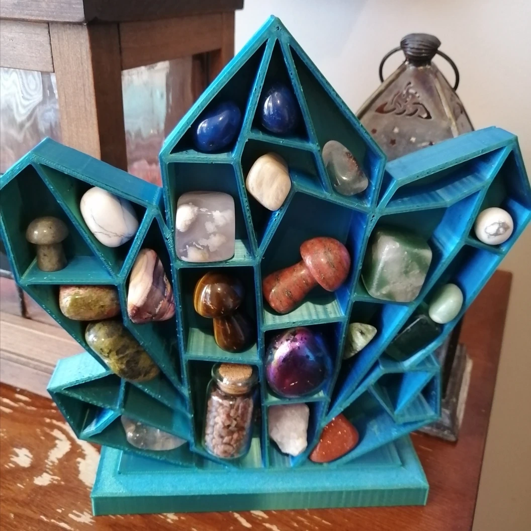 Teal crystal display stand, 3D printed. Holds many crystals of various sizes.