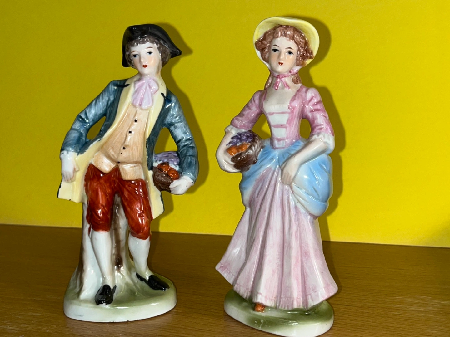 Pair of vintage porcelain figurines. A man and a woman in 18th century clothing. Both figures hold baskets. The figurines are about 6” tall with a 3” wide base. Excellent condition.