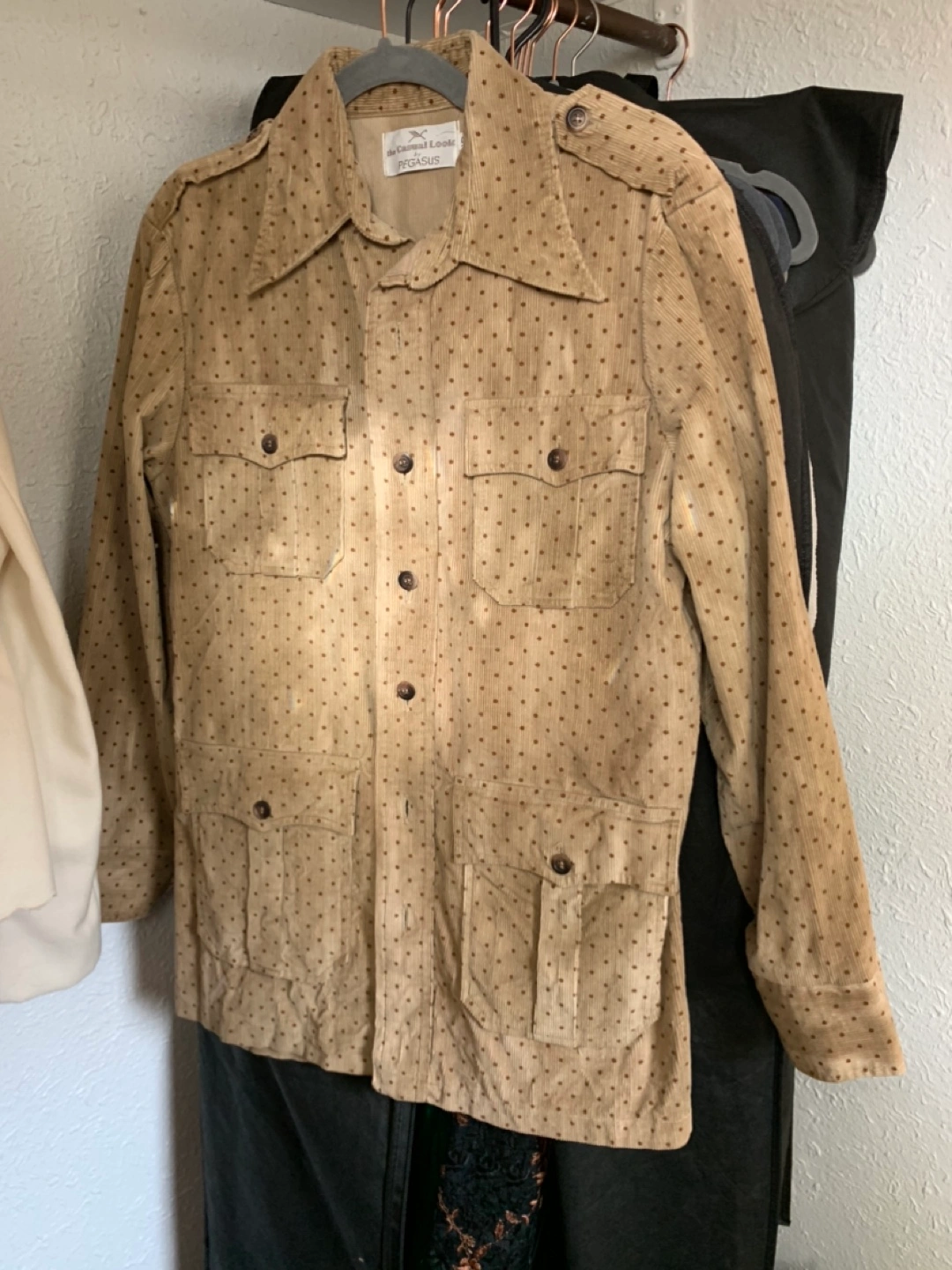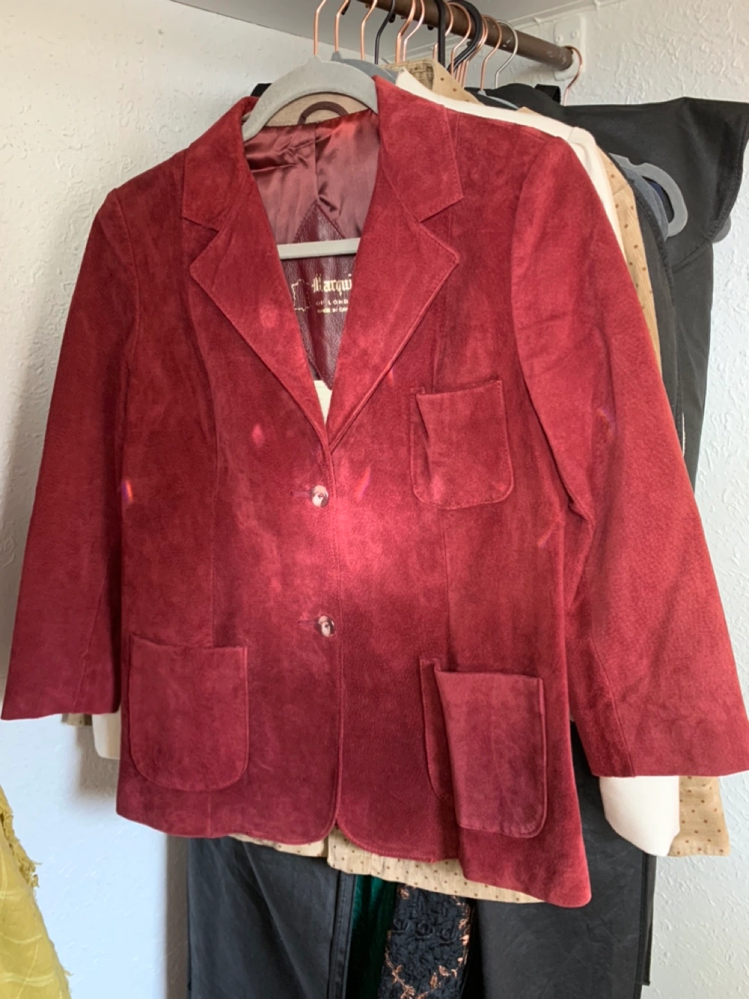 Three vintage jackets: one burgundy suede, one white wool with scalloped hem, and one tan corduroy with a polka dot pattern. All are in good condition.