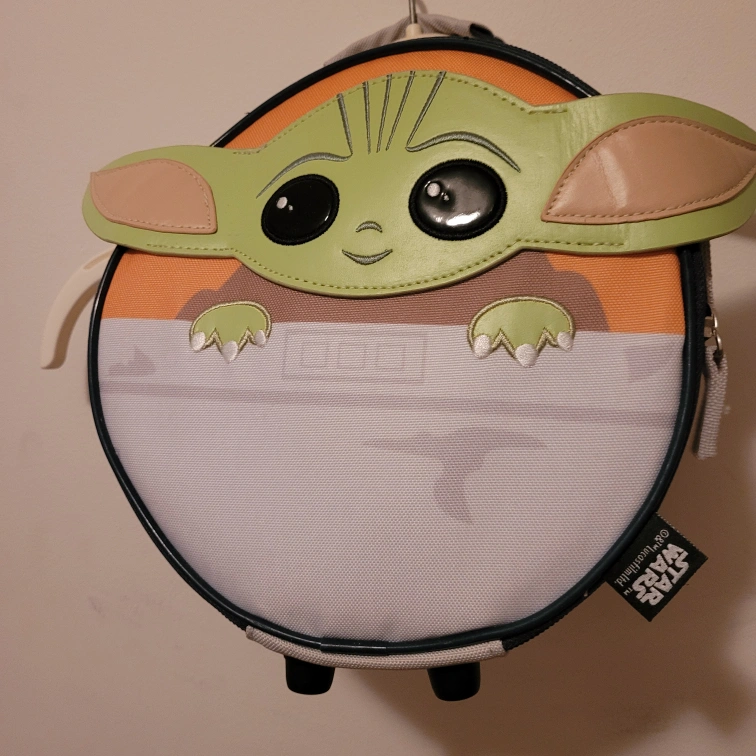 Cute Baby Yoda backpack. Small and round with a zipper closure. Four rubber feet on the bottom. slight discoloration on side, see last photo.