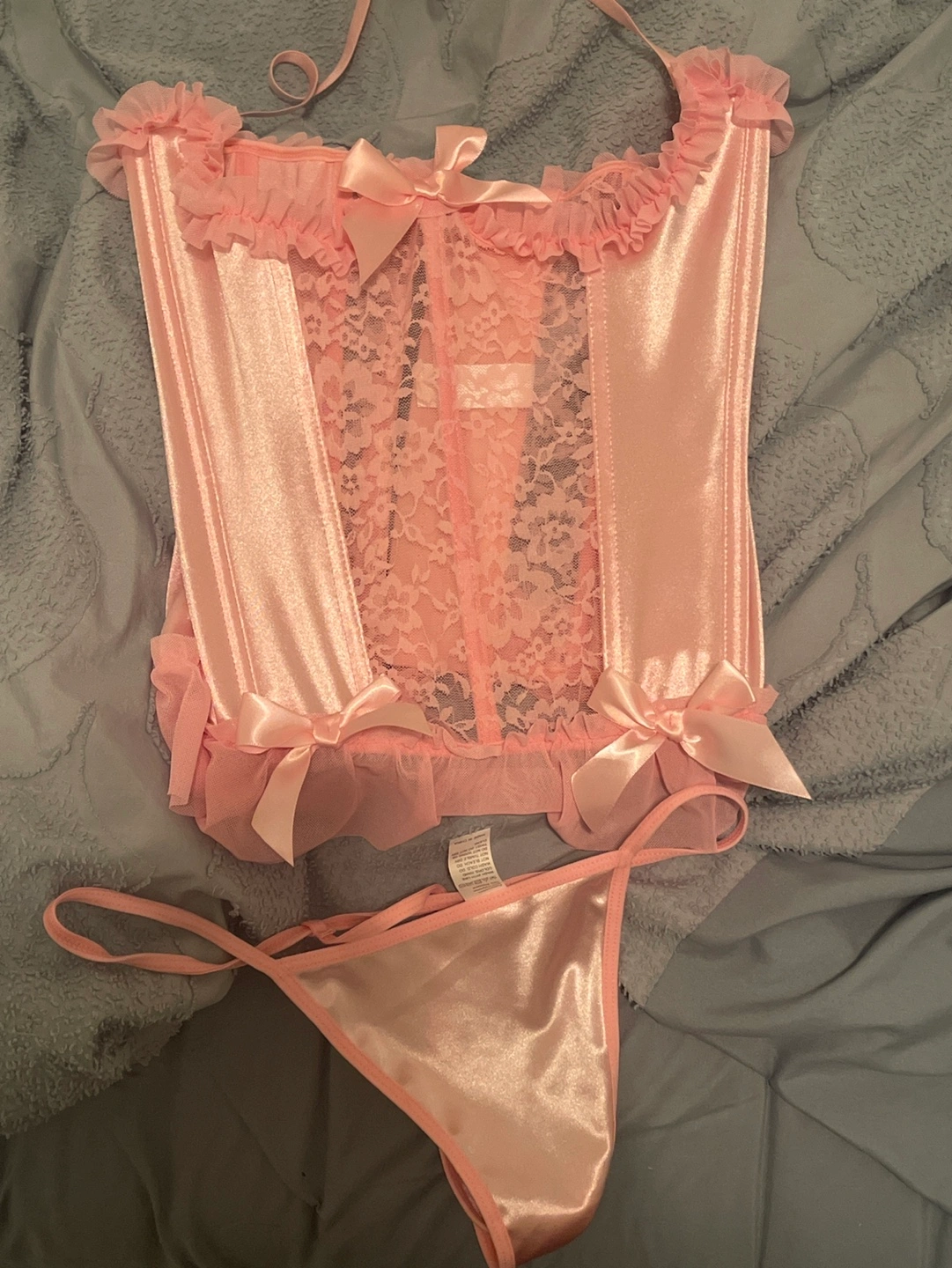 Pink satin and lace corset with a matching g-string. Features a bustier style with boning and an adjustable back closure. Has a cute bow detail on the front and ruffle trim.