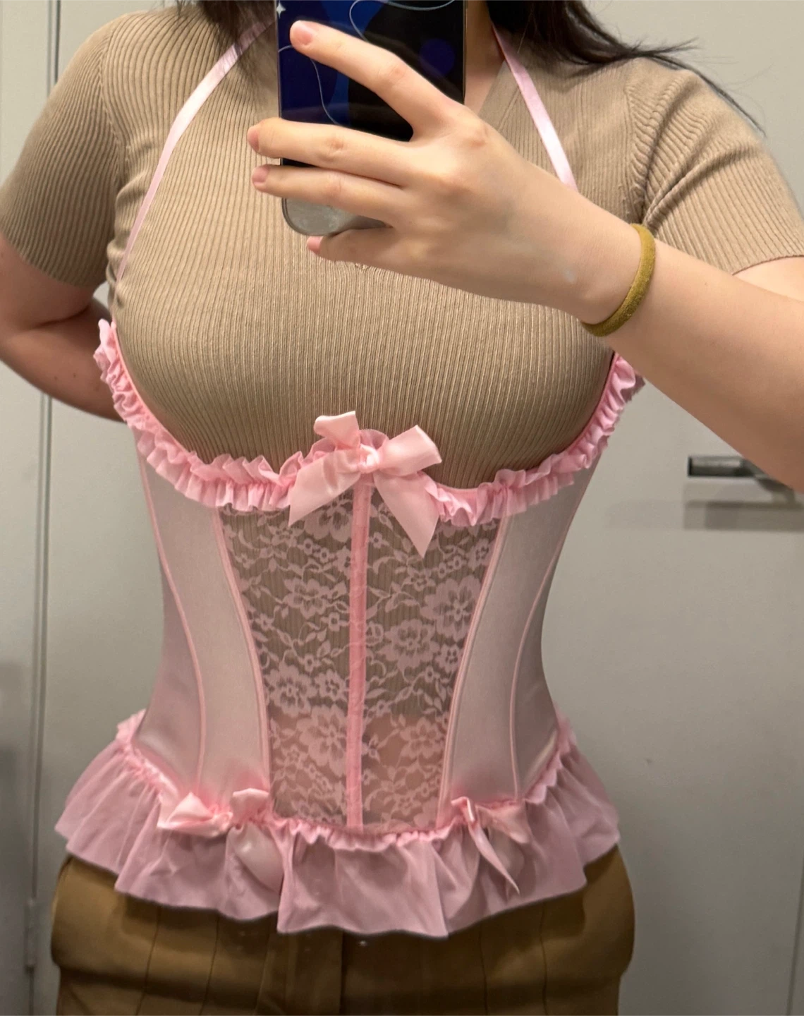 Pink satin and lace corset with a matching g-string. Features a bustier style with boning and an adjustable back closure. Has a cute bow detail on the front and ruffle trim.