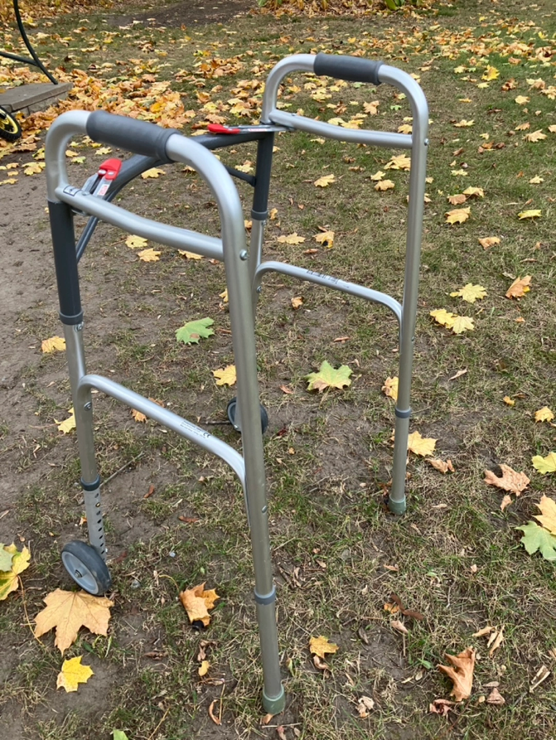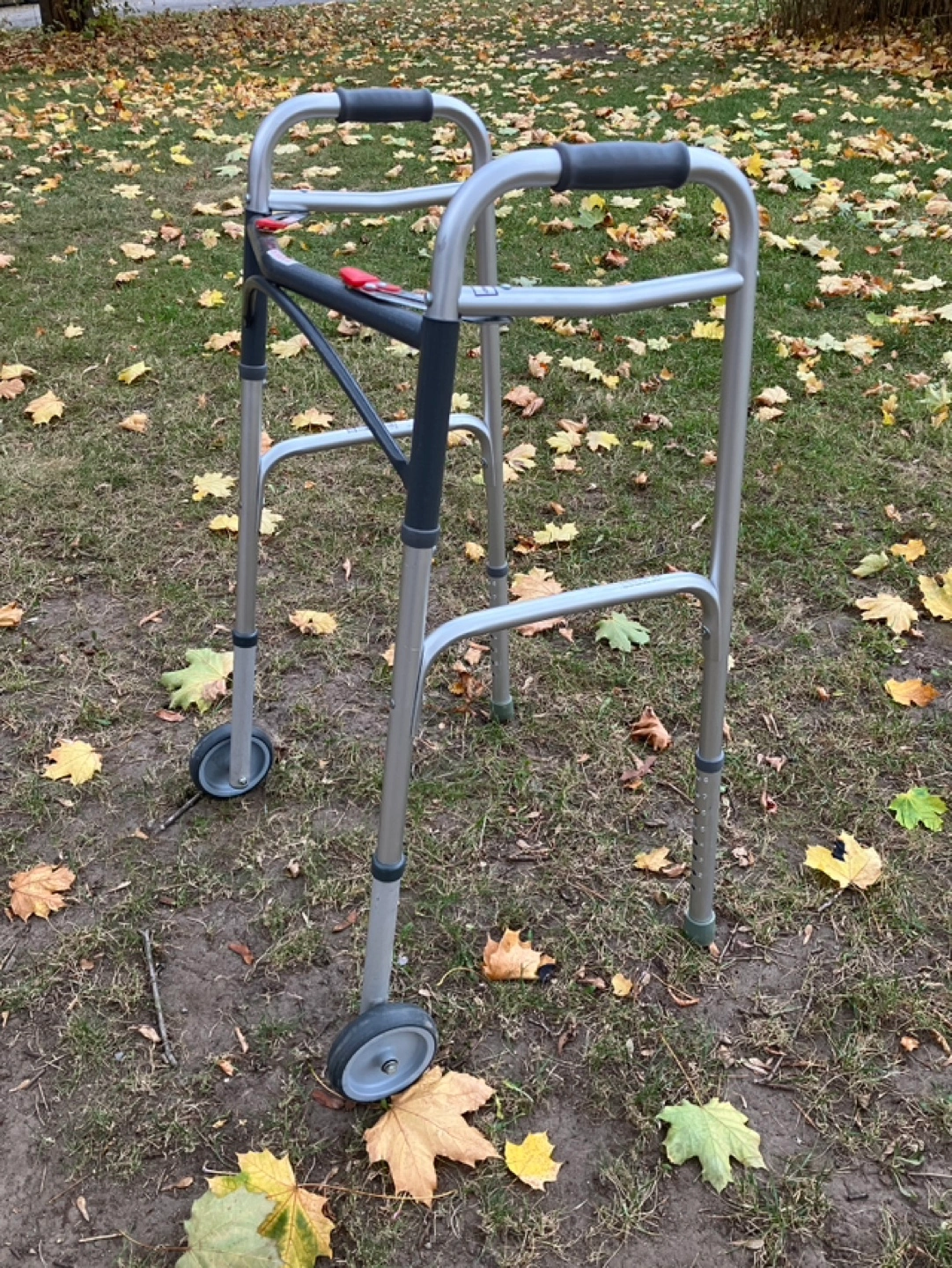 Walker with 2 front wheels, Like New. Adjustable in height. Lightweight aluminum construction. Folds for easy storage.