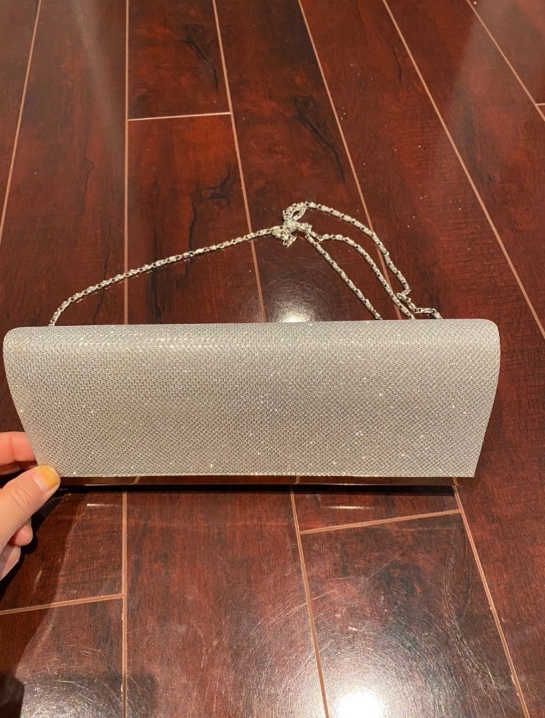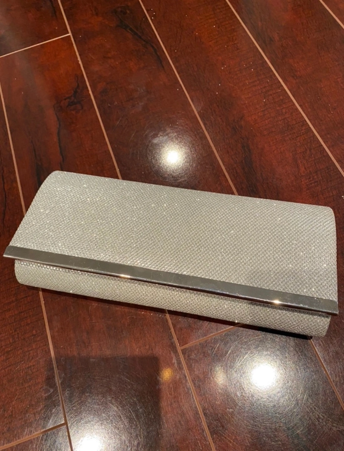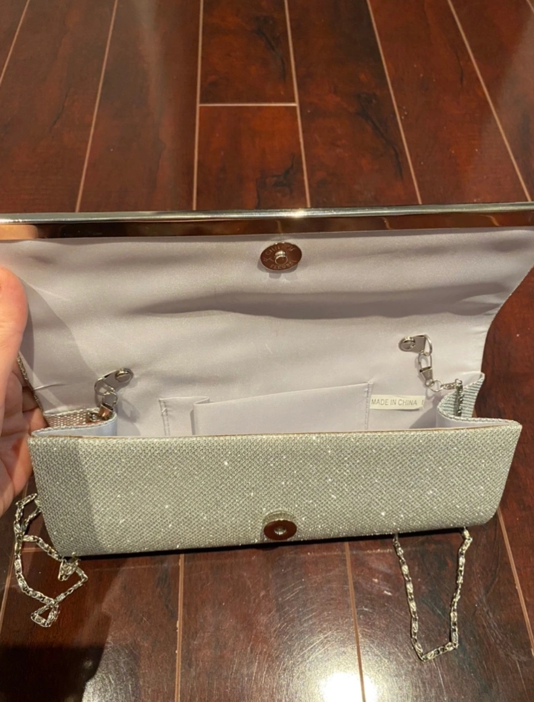 218Silver sparkly clutch with a chain. Has a magnetic closure and a pocket inside.